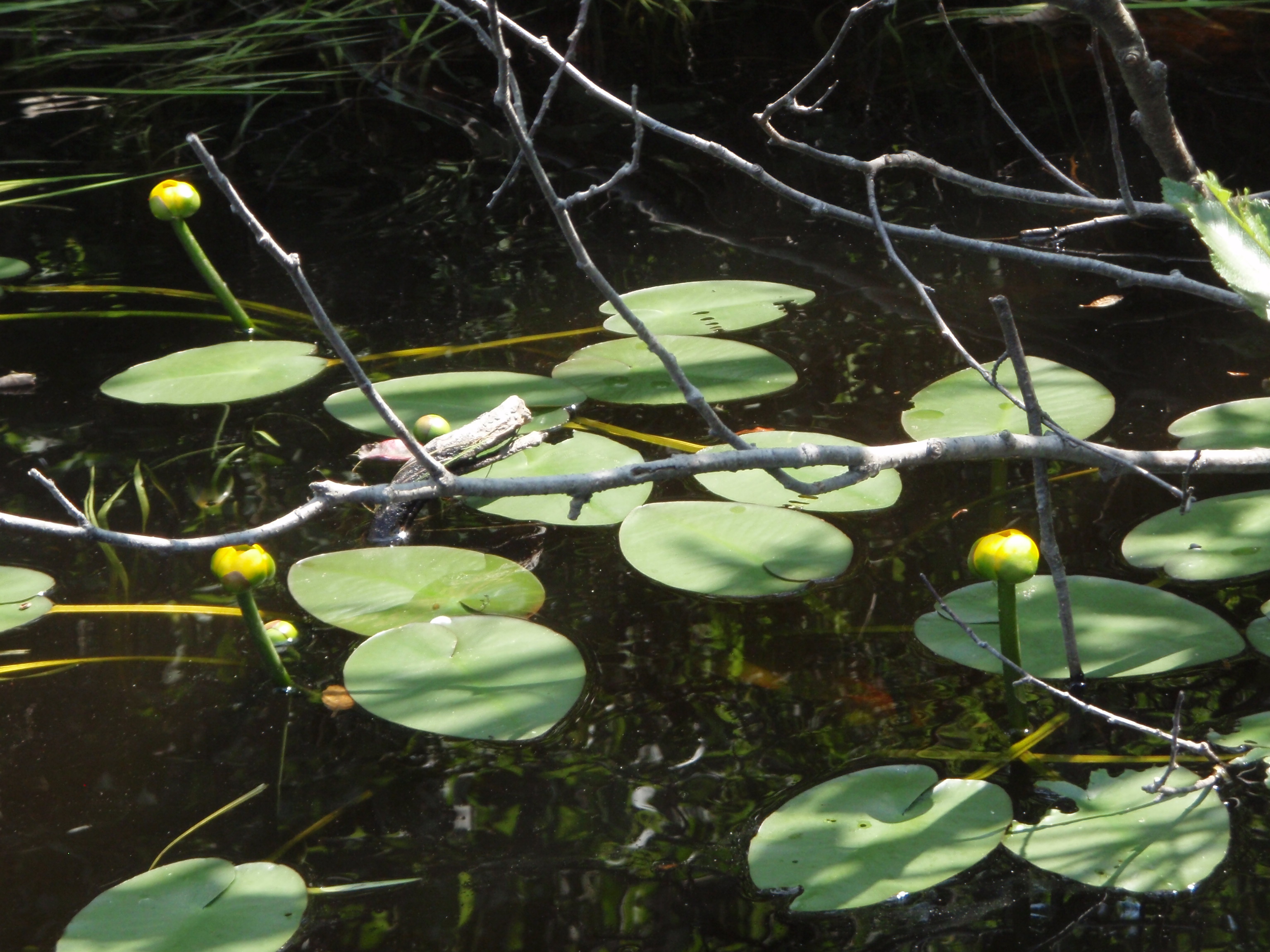 The brook was a windy waterway with walls of alders, sweetgale, and laurels. Occasional tamarack or fir tree would rise up higher. Beaver and muskrat evidence was everywhere. Lots of little trails leading through tunnels of alders onto islands intrigued us, but we stayed in the boat. We found a little pond, complete with pond lily, and hung out with fish, frogs and dragonflies.