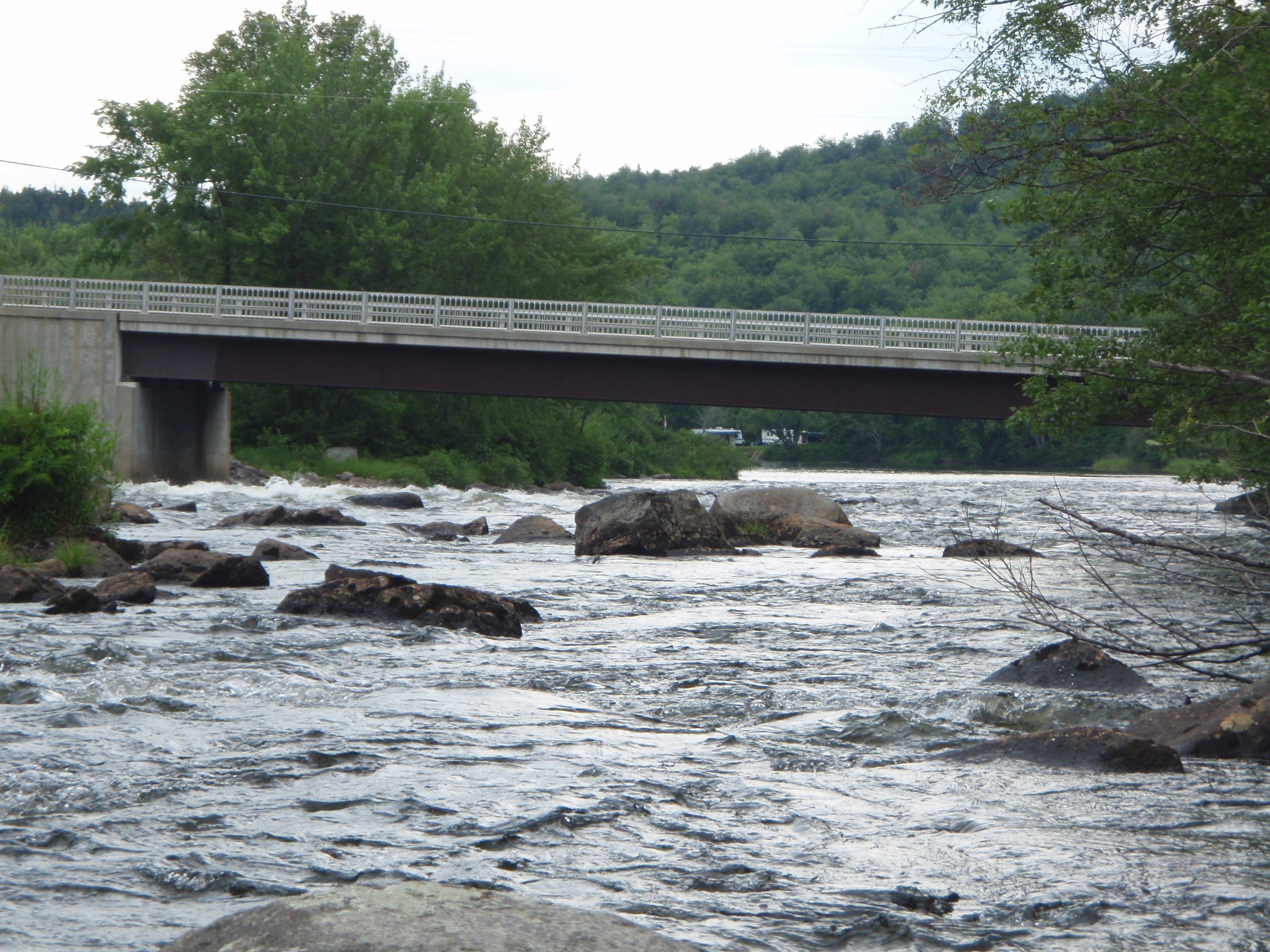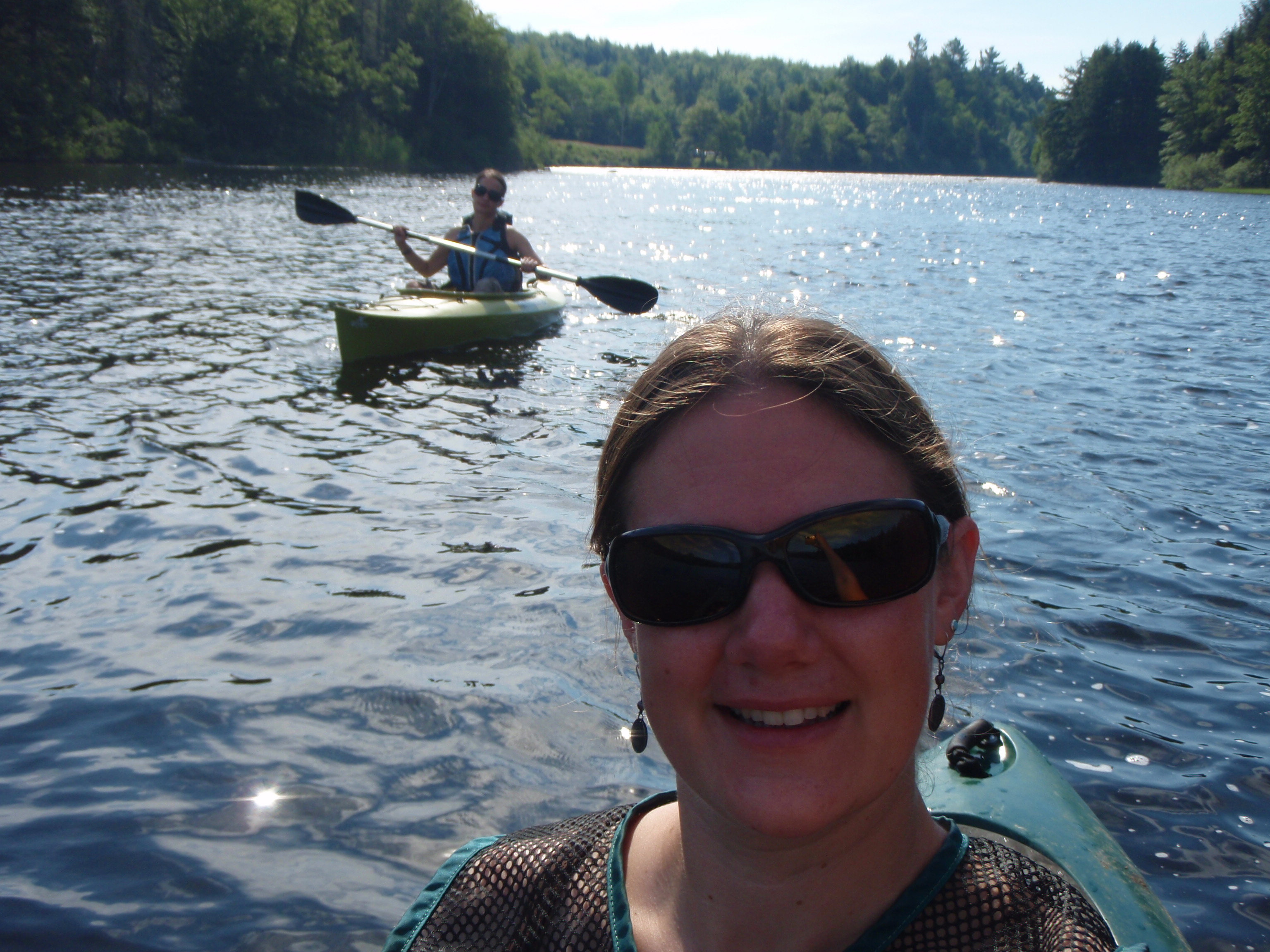 We paddled down the Androscoggin River watching loons and trying not to interrupt too many fishing lines that boaters were dragging behind them. We eventually came to our portage at the Errol Dam. We pulled our boats out and managed to carry both at the same time on the short portage around the dam. After this we hit our first rapids. Even though we were in kayaks and had our gear in water bags, we did not have skirts so we were wet after the first rapids. Lindsay had never been kayaking on a river, but Amanda had some experience and talked Lindsay through her first class II. It was fun and we learned to perfect how to approach and when to avoid certain rapids. Very quickly we came to the class III rapids that flow under the Errol Bridge. Being the braver of the two, Amanda zipped down them like a pro, but Lindsay bailed and portaged across the road to the other side of the bridge. Even with the portage, the rapids were still pretty amazing just below the bridge. What an adrenaline rush!