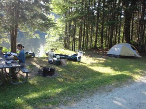 The next section of the river was calm and beautiful. We snacked, opened beers, and enjoyed the views. Our campsite at Mollidgewock had its own river access and we managed to spot our tent to know which site was ours. We had made good timing and took our time cooking dinner over the campfire. It felt really fun to be camping at a campground where everyone else had driven in and we had kayaked to our site! A friendly camping neighbor entertained us until late in the evening before we slept soundly until morning.