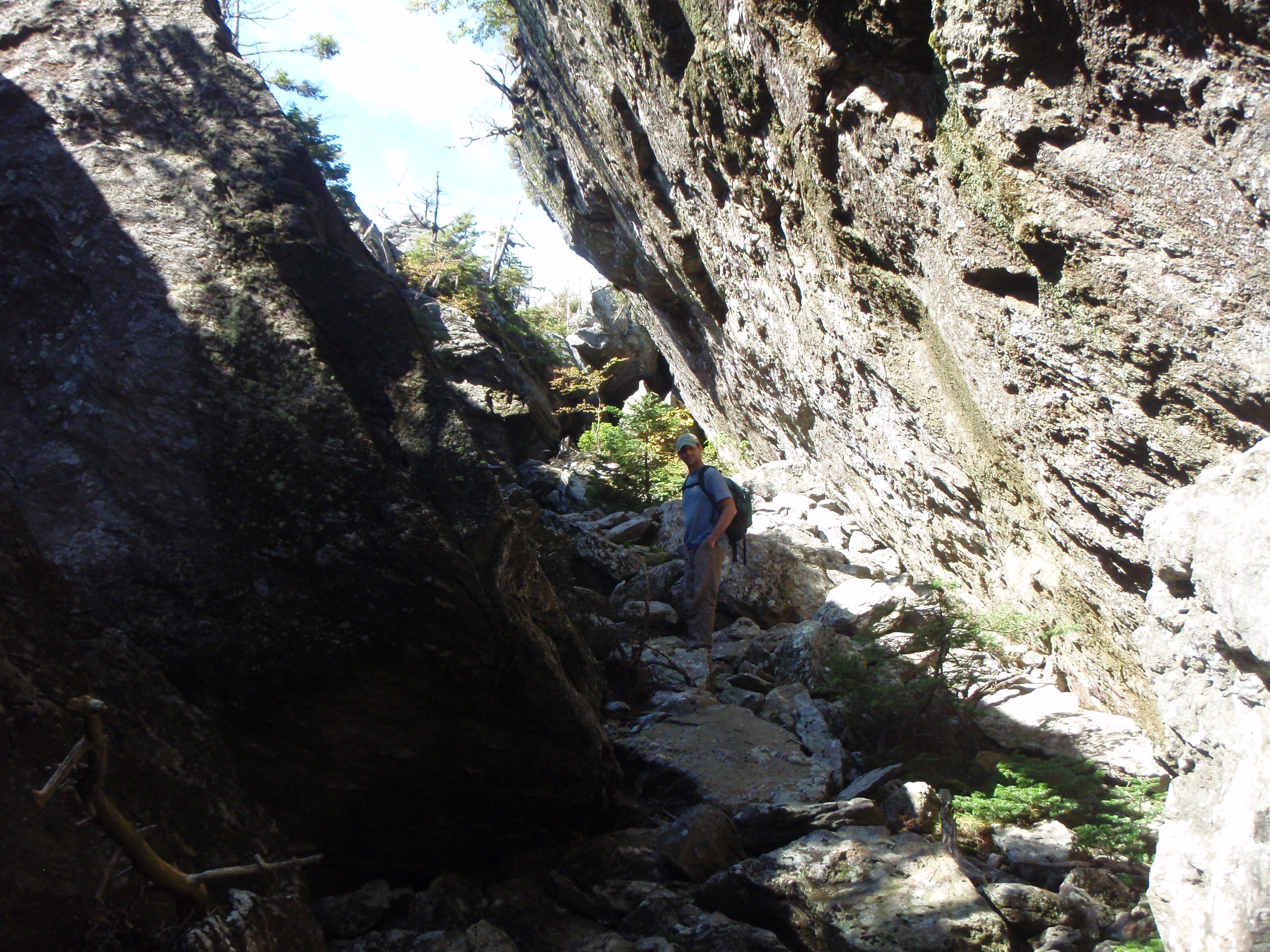We summitted Mount Mansfield, The Chin, after our break and had wonderful views down into the Vermont valleys below. What a feeling to be at the tip top of Vermont. Then we walked back along the ceiling of Vermont, as the Long Trail wandered along the mostly open ridge often skirting cliffs with many side trails dipping precipitously past the last visible blaze. At a ridgeline hut we asked the GMC Steward where we could pick up the Canyon Trail. She enthusiastically gave us directions and said that it was worth it. We didn’t have a trail description, just a map and wanted to explore some of the trails near the summit. In the mid to late 1800’s there was a Hotel or Mountain House on the mountain, and we knew that trails around these old buildings usually brought guests to unique features or interesting view points. Plus, with a name like Canyon Trail, we were sure to find something interesting.