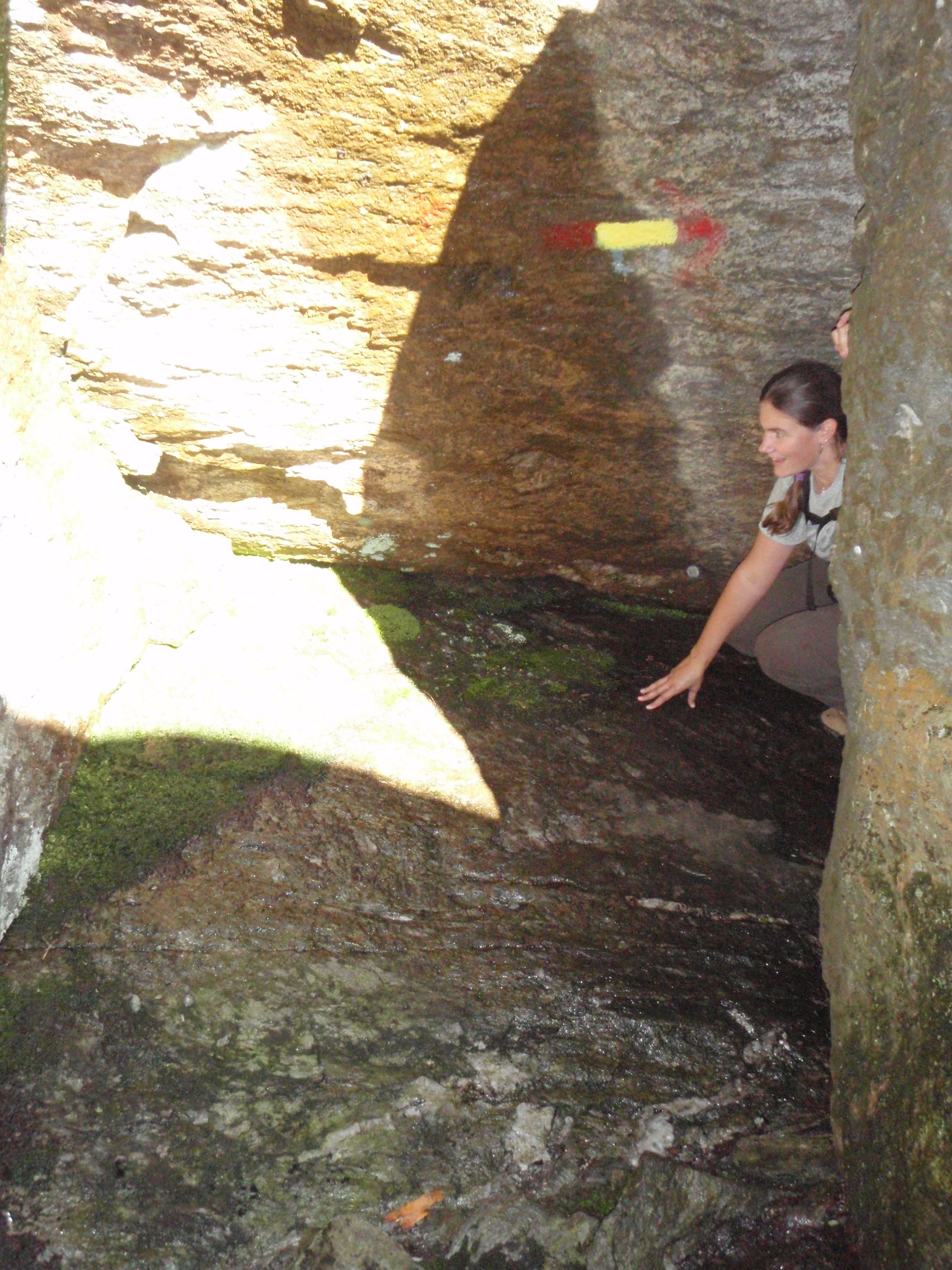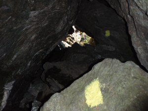 The Canyon Trail parallels the Long Trail to the west but it is another experience for sure! The start of the trail is mossy and narrow, a sign that not many people go on this trail. We quickly came to the canyon, where you drop down between two slabs of rock. Both of us had to keep our composure and over come the feeling that the ridge above us was being held up by this rock we were walking underneath. After that the trail squeezed you through a hole that forced us to take off our packs to get through. At one point we had our choice to take the left bouldery trail or the right trail that was a straight shot between rock slabs. We both took the right, but it was like a fairy tale scene where the closer you walk to the door, the larger you get and the smaller the door gets. It was an optical illusion and we had to crawl and squeeze our way through! But from afar it looked like no problem. The trail continues on, squeezing through boulders, teetering above dark chasms, and finally pops out on soil again. What a great trail! Definitely a must if you ever hike up Mount Mansfield.