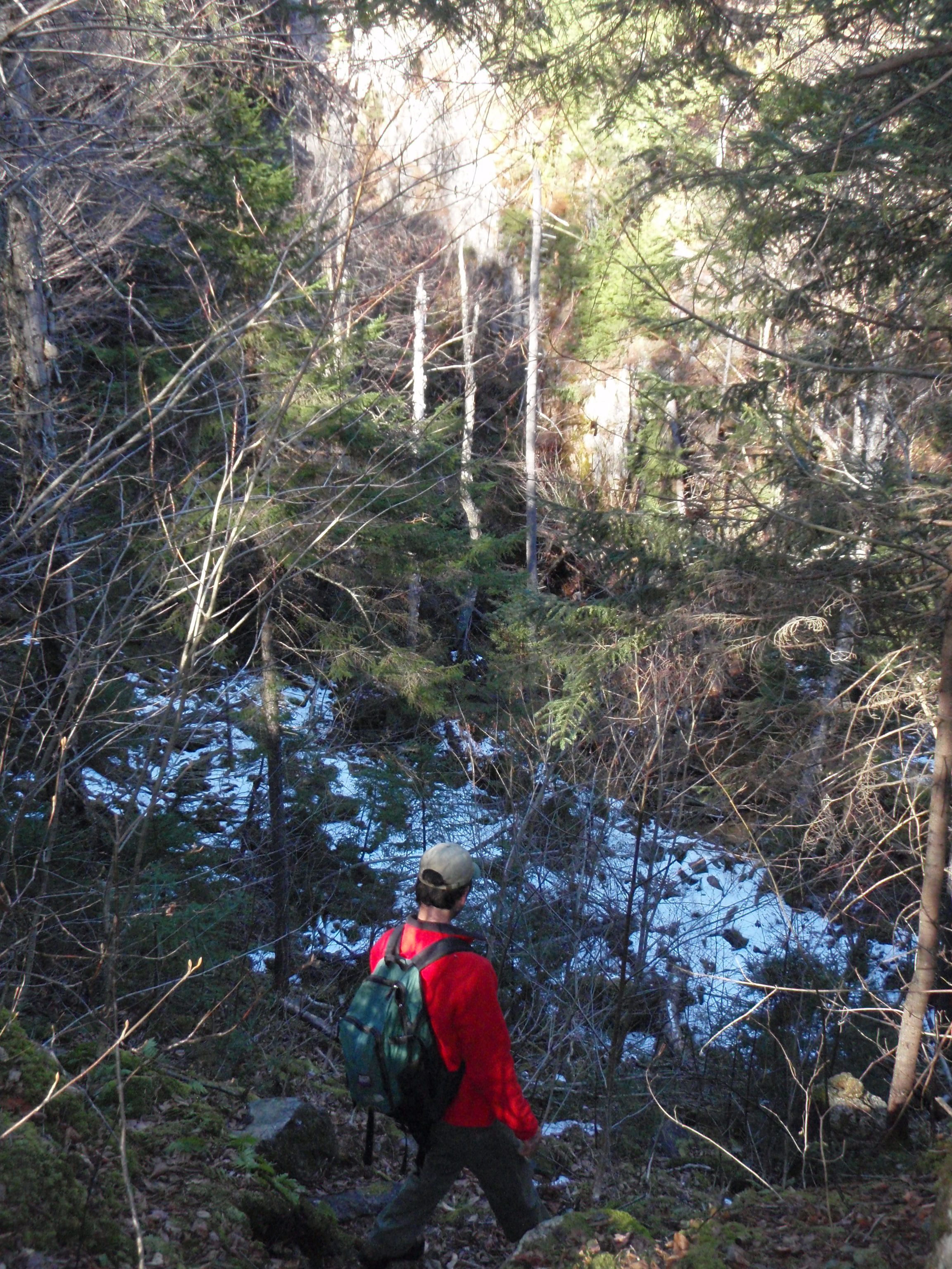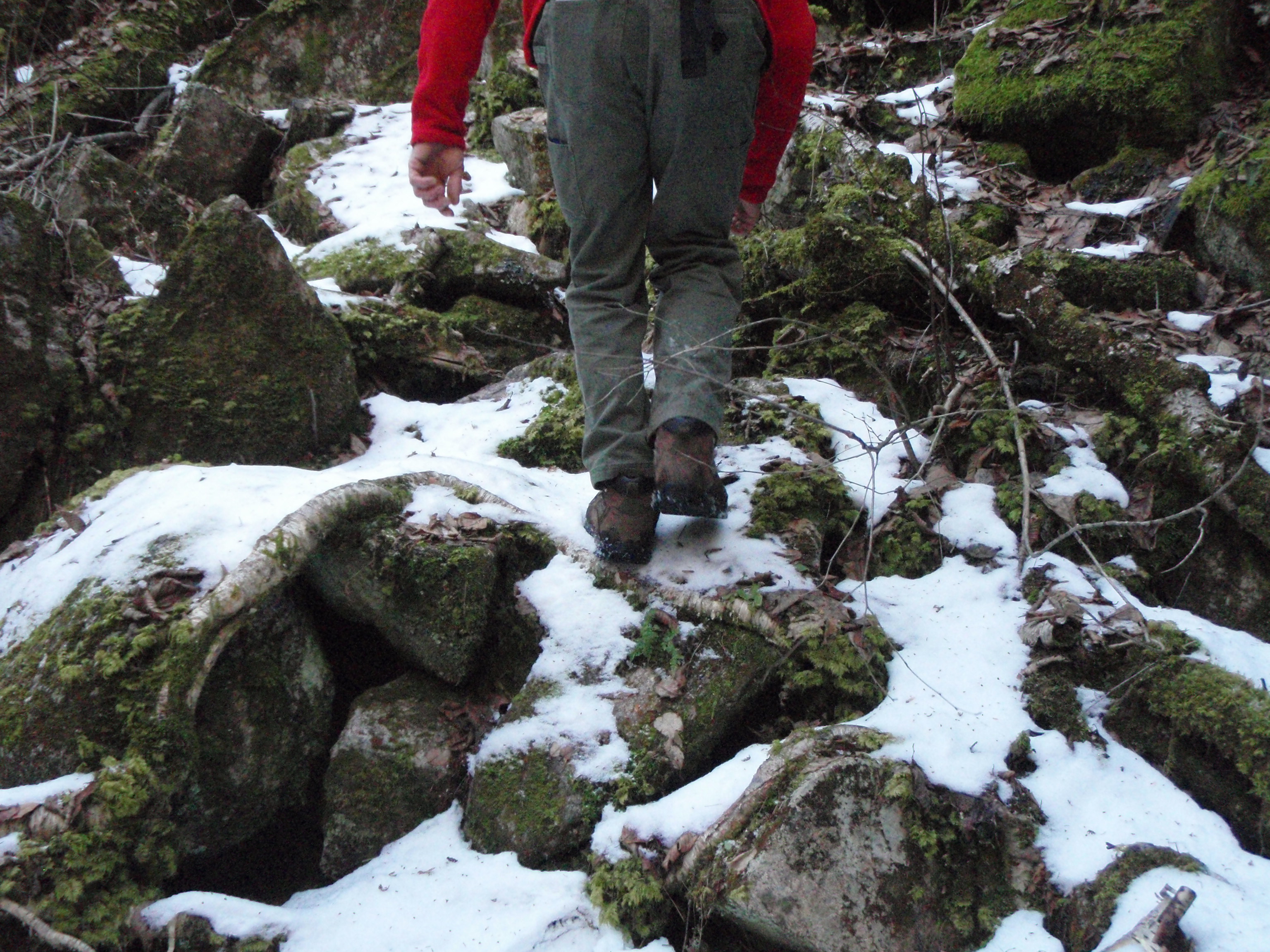 This trail, now only enjoyed by locals, was originally an old AMC trail for crossing over Hunter’s Pass to the Bog Dam Loop Road. Some old maps named this trail the Bog Dam Trail. Even though the trail is not a popular hiking trail, the local mountain bikers maintain the lower section for other loops in the Town Forest. The trail leads you through a hardwood dominated forest above Moose Brook the entire way. The leaves had all fallen and we could see far into the woods. We even scared up a couple of ruffed grouse. Andrew said that we could be at Peboamauk in 45 minutes if we were “diligent”, so we traveled swiftly with few stops and within 30 minutes we were at the “marked birch” trail junction. This four way intersection is only marked in two directions. The trail sign indicates west for the base of Ice Gulch, south to Randolph Hill, but we came up from the east (which does not have a sign). The trail to the north (which is also unmarked) drops you into the floor of Peboamauk, at the foot of the waterfall.
