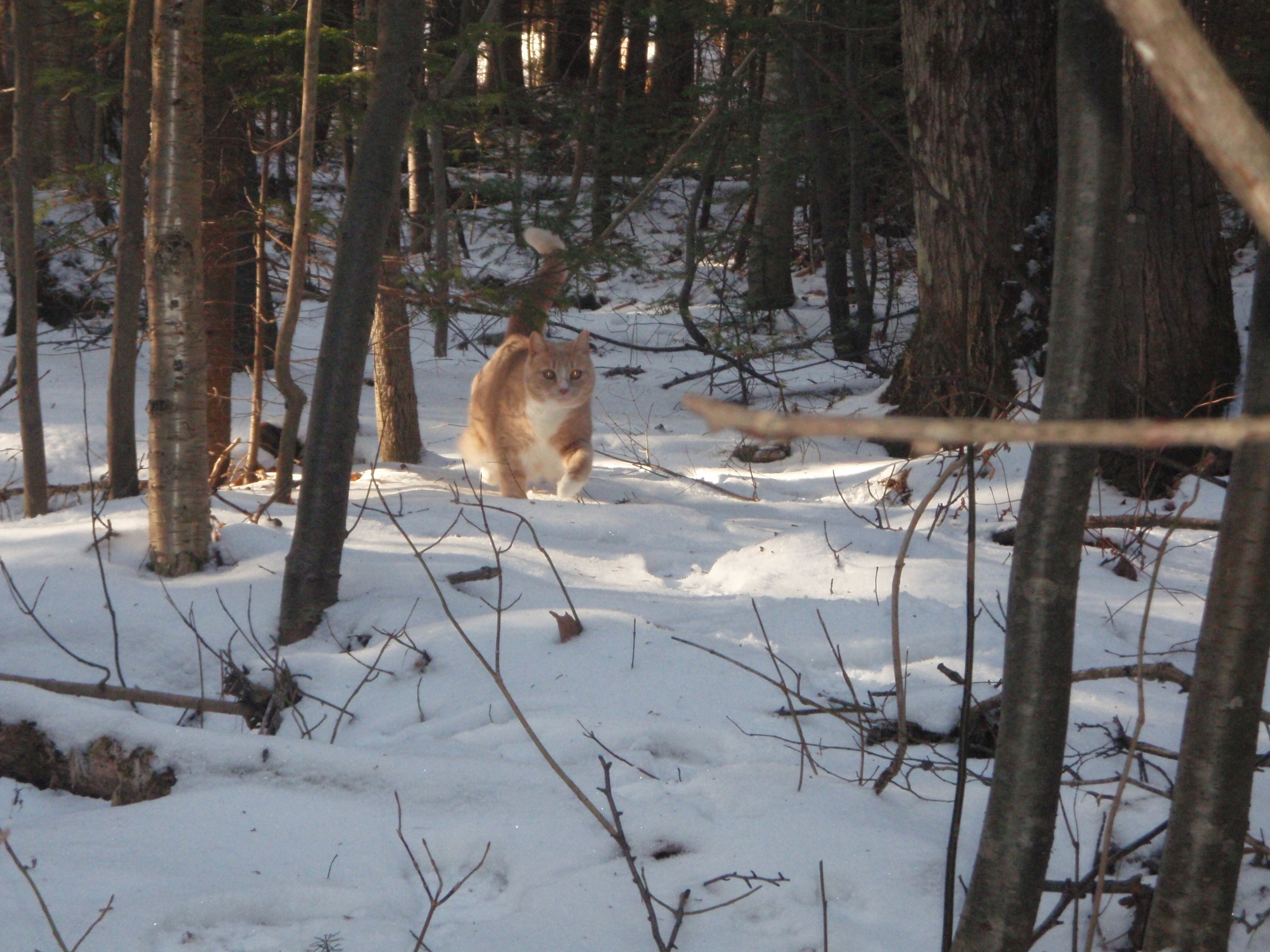 Muncy is always eager to go on a walk with us through the woods. He bounds through the woods, climbing trees and chasing the other cats.