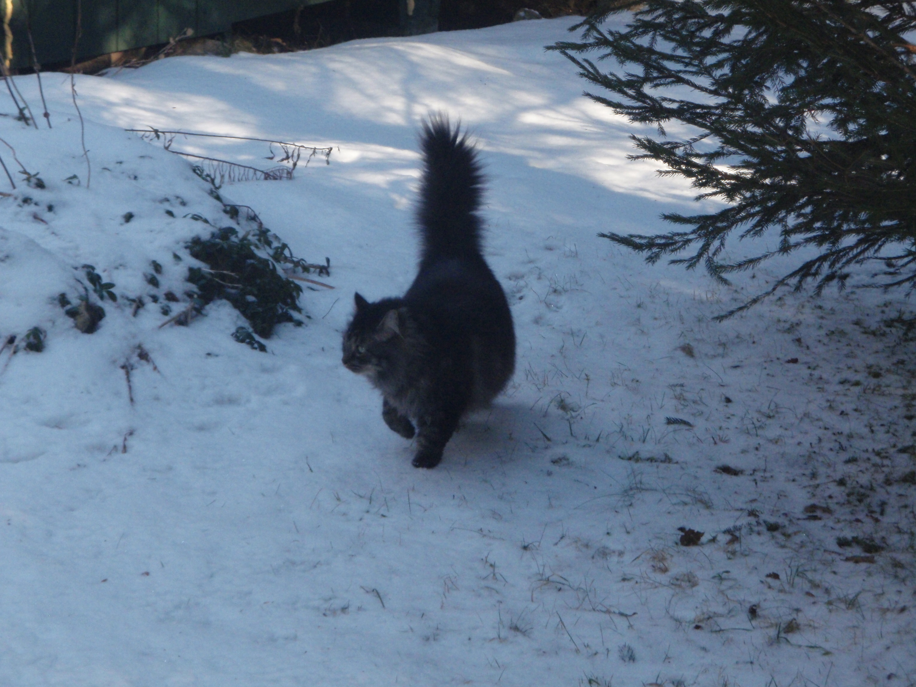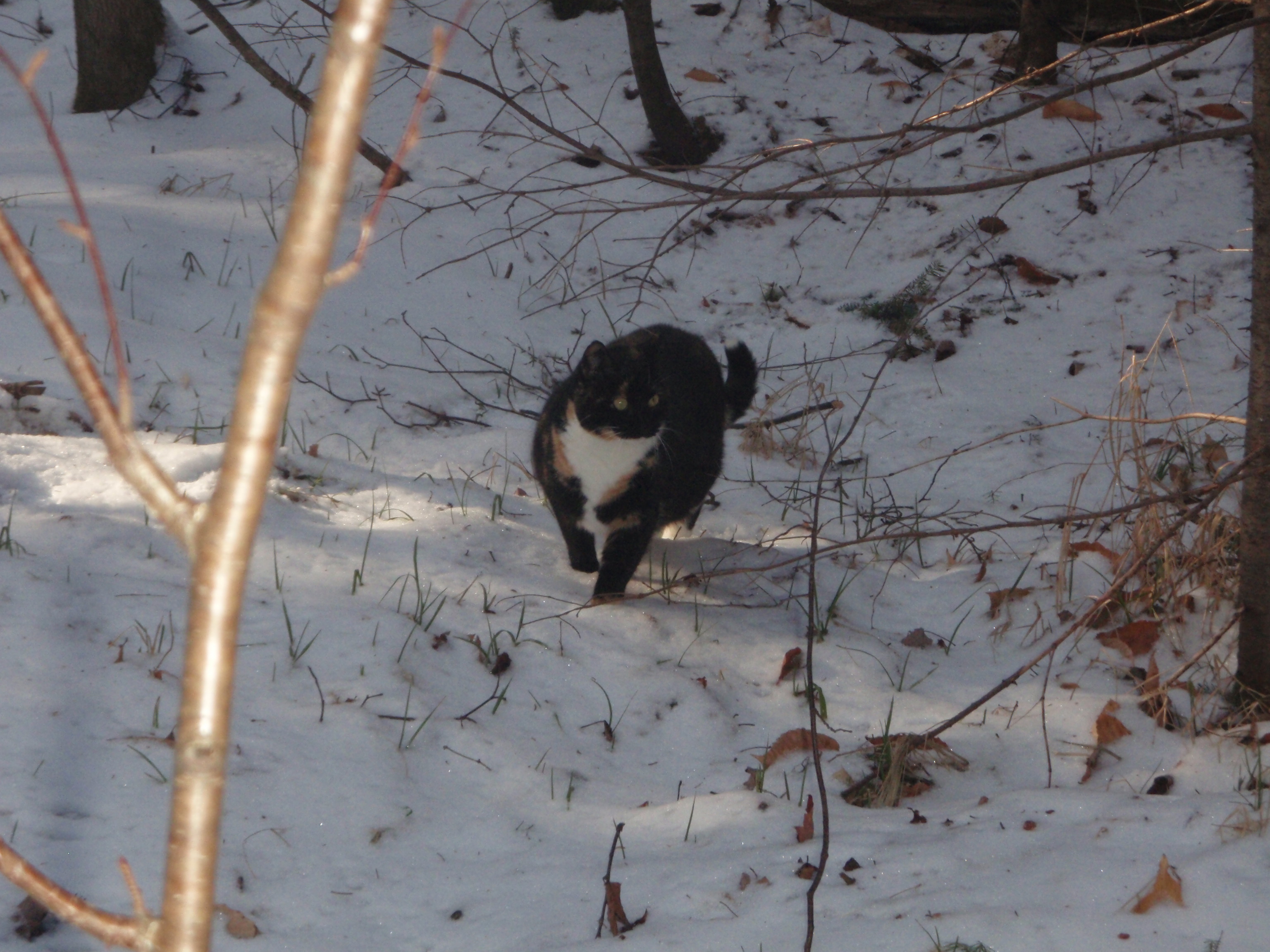 After the first cold snow fall, it isn’t unusual for one of us to carry one the cats for a little bit during the walk. A few minutes of warmth and love seems to encourage them. Muncy gets very excited when we go for walks and tends to get very cuddley, rubbing our legs, meowing, and begging to be picked up. But at any moment he’ll jump out of your arms and run full steam ahead toward a tree.