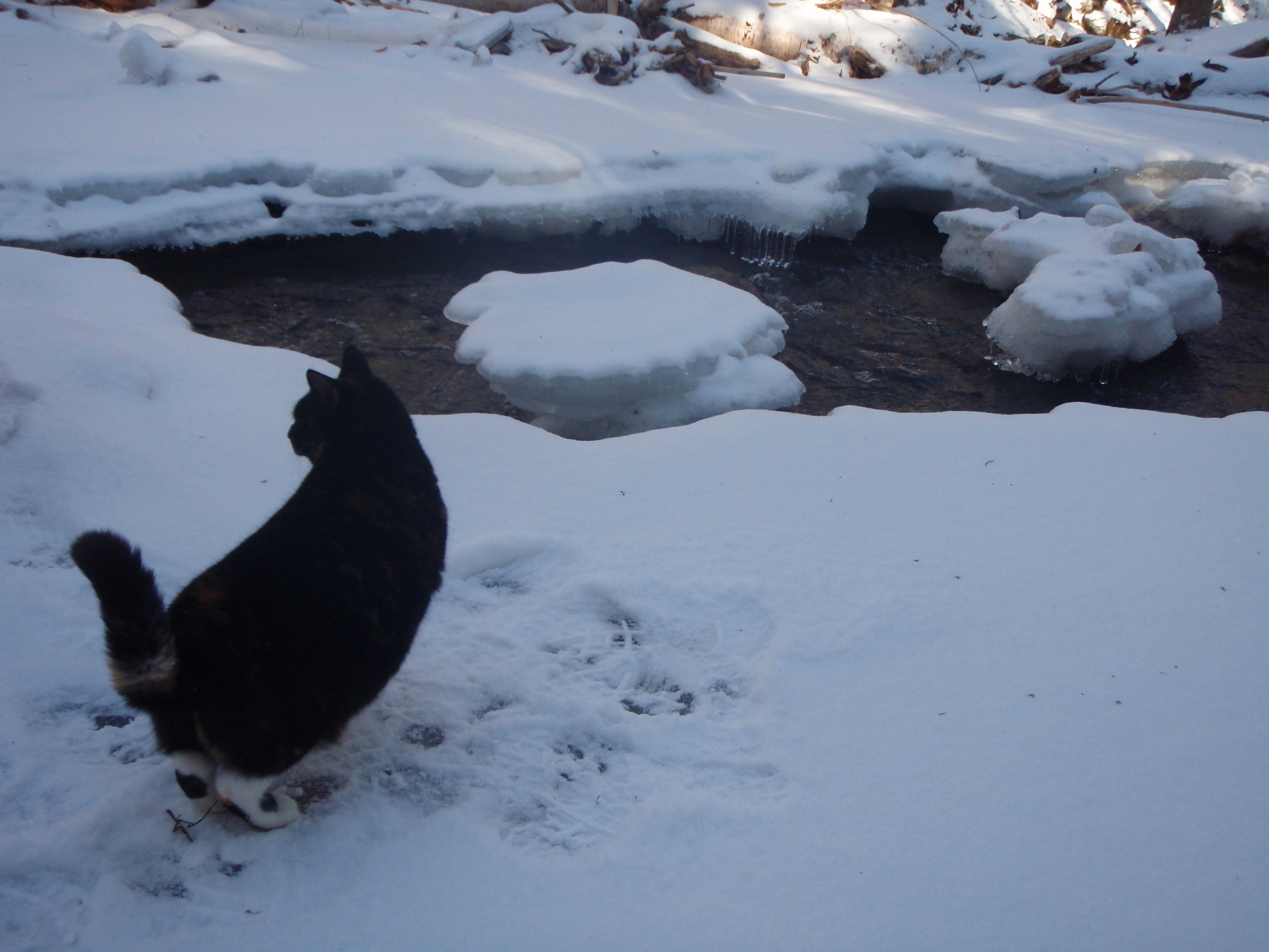 When we walk down by Crescent Brook, only Mama and Muncy walk out on the ice. Even with us calling to her, Butters wouldn’t go near the Brook. Maybe she fell in recently, like Mama almost did a couple of weekends ago? We had taken the cats here on a particularly warm day and Mama broke an ice chunk into the Brook almost falling into the frigid water herself. She doesn’t seem concerned today.