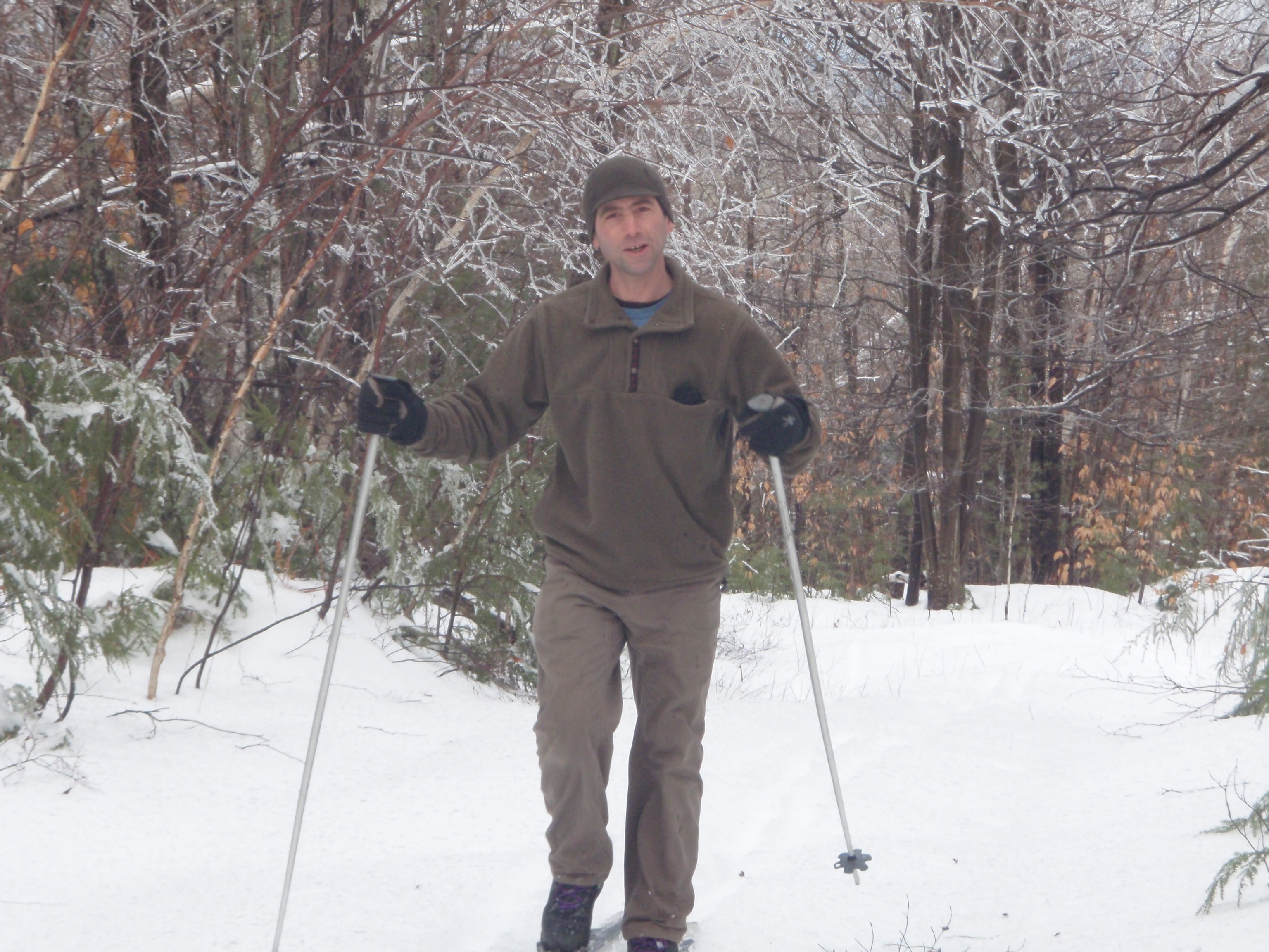 The ice in the trees sparkled in the sunlight, dripped to the ground, and occasionally chunks of ice would fall and spring the tree banches upward toward the sky.  We skied past a Loon Echo Land Trust kiosk and parking area for Bald Pate Mountain trail, and saw two groups of snowshoers on their way down from that short hiking trip to the top.  We soon made our way to the highest point on the ski trails. The woods in this area consisted of mostly young birch with the occasional group of older hemlock and pine.  We skied down a nice little hill, faster than usual because of the ice, and ventured down an ungroomed section of trail to check out a potential view (through the trees).