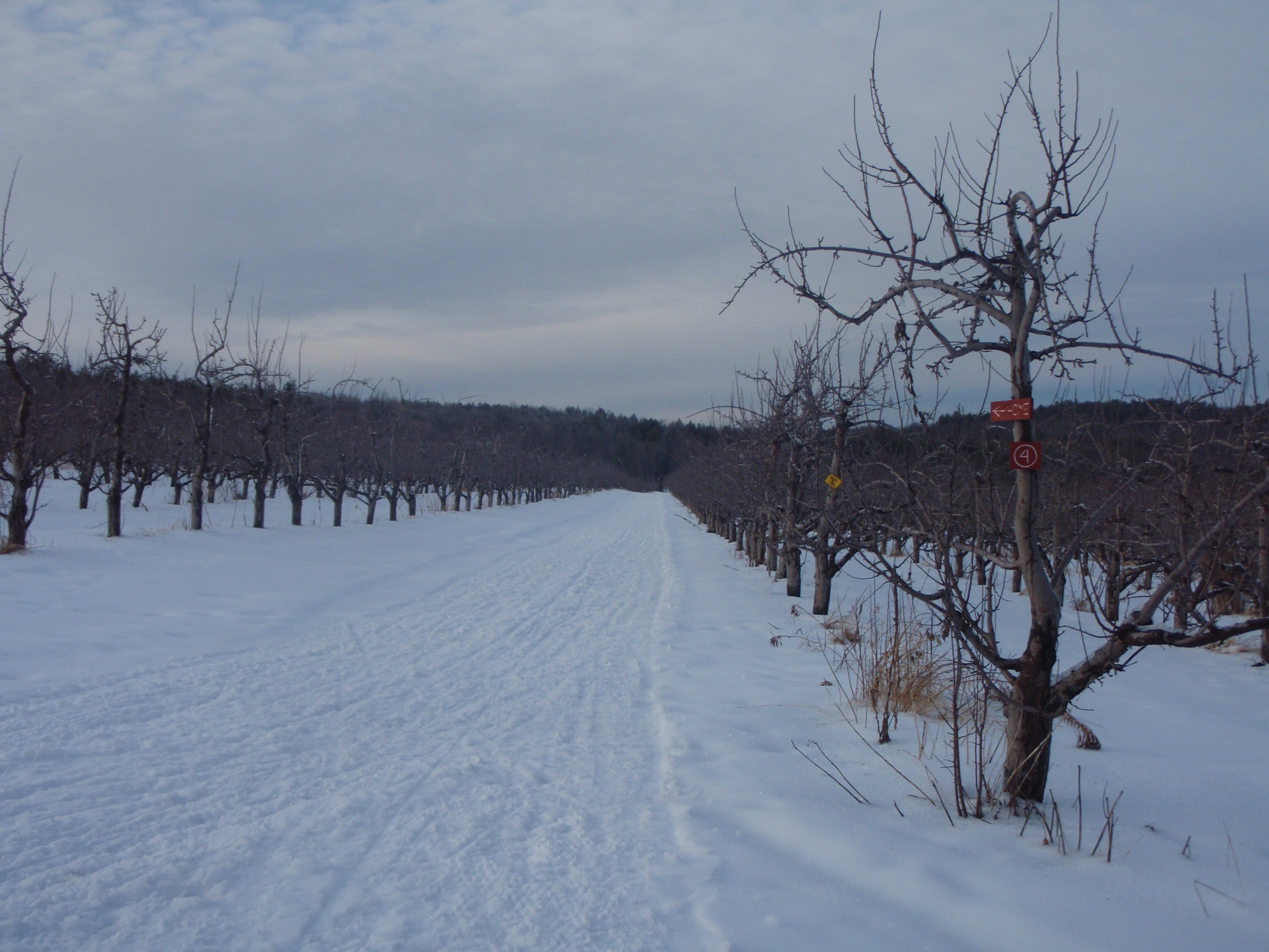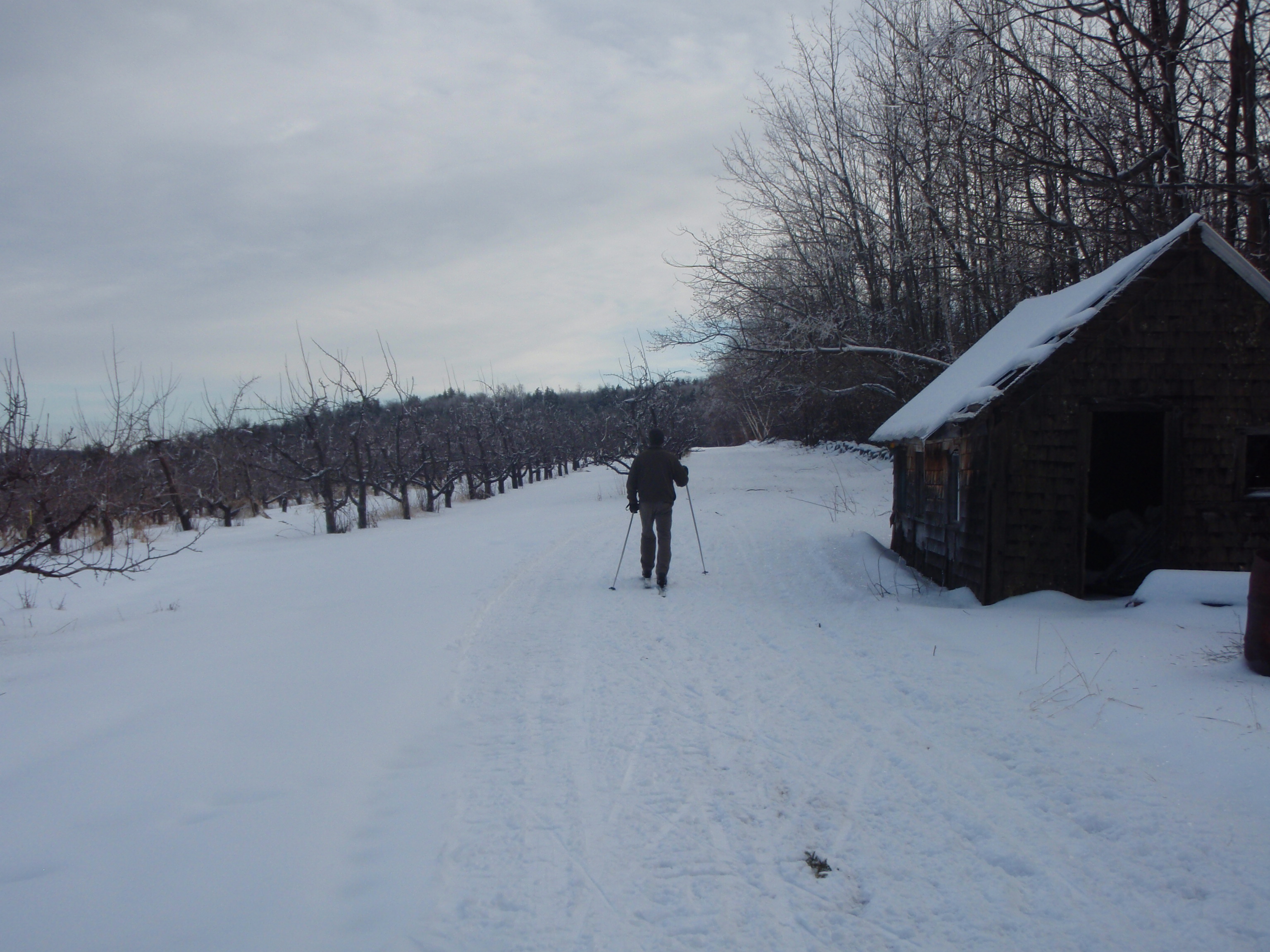 We looped back up and followed a trail into one of the apple orchards.  Nicely pruned apple trees stood all in a line as we skied next to them, enjoying a view of the Foster Pond below the fields.  We continued looping on the trails and found the trail to the lower woods.