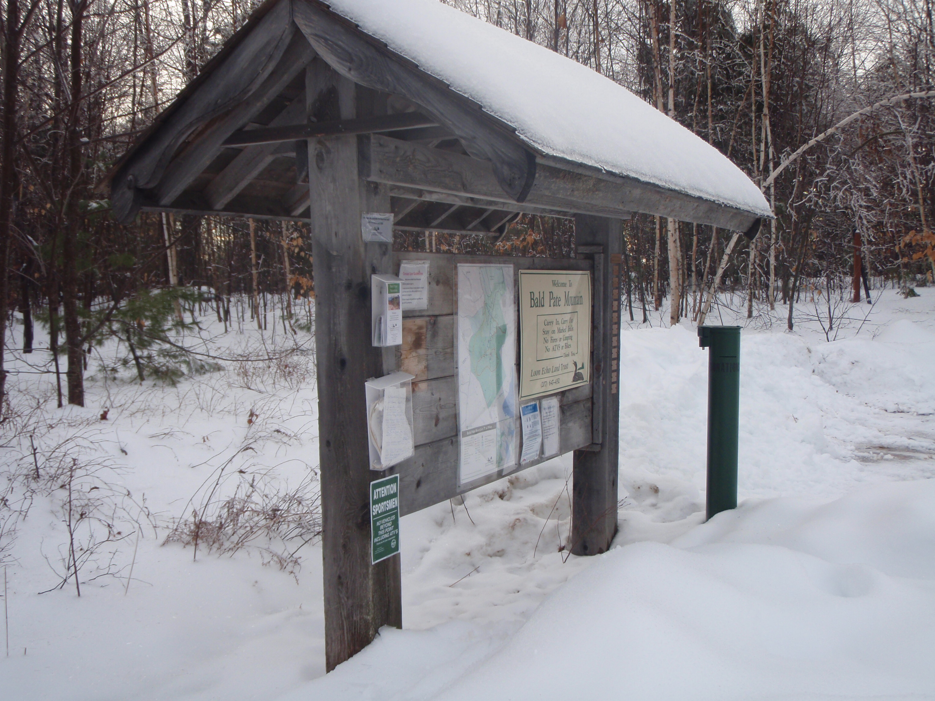 Loon Echo Land Trust kiosk for hiking trail up Bald Pate Mountain.