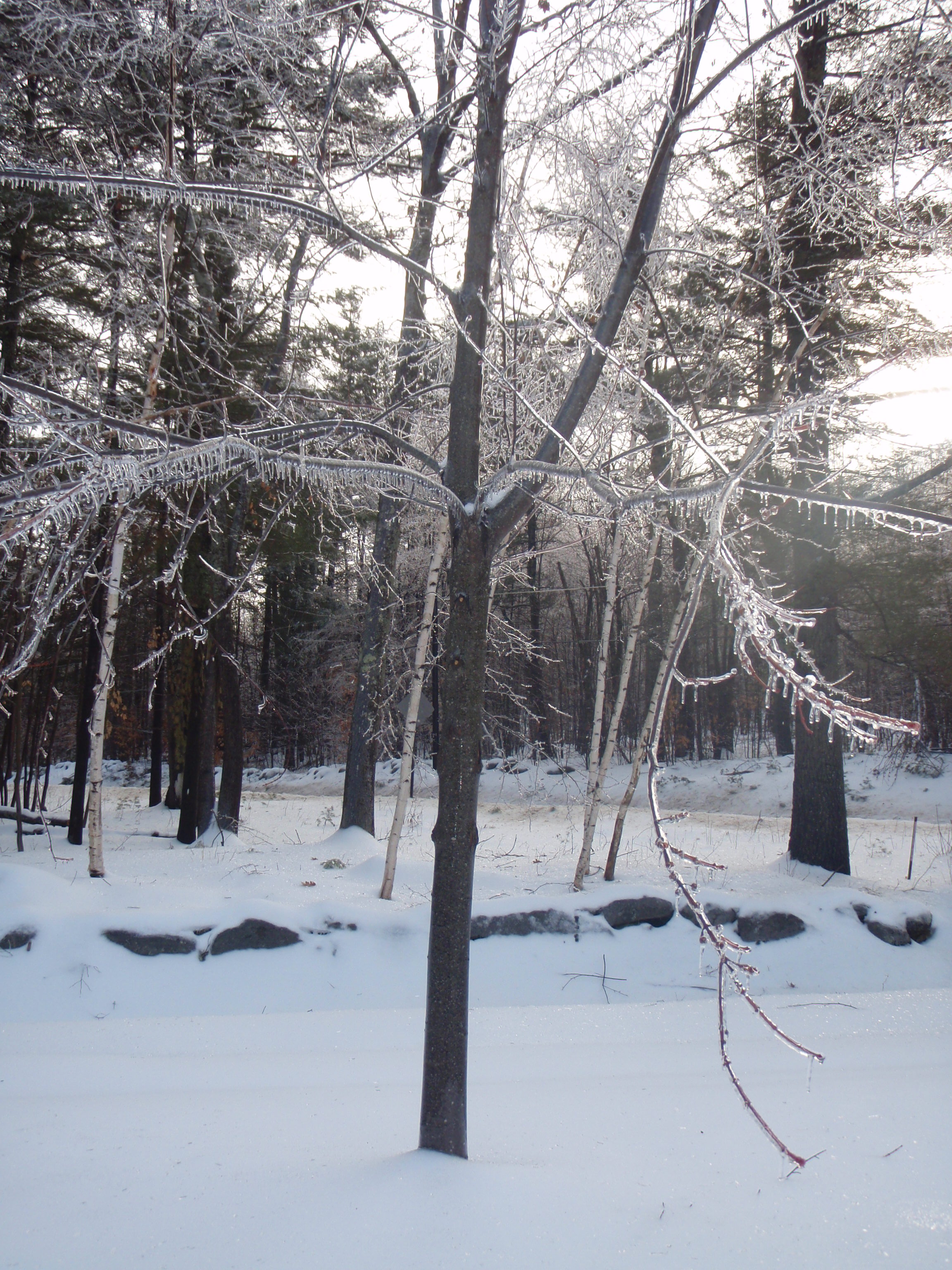 Tree branches encased in ice, slowly melting as the temperatures rise.