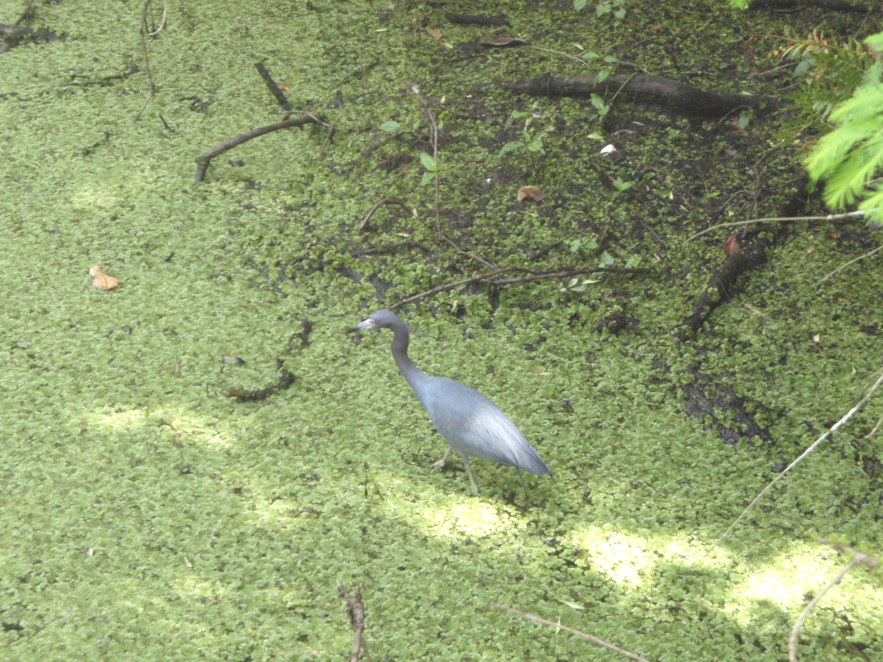 We watched this little blue heron slowly walk through the green murky water.