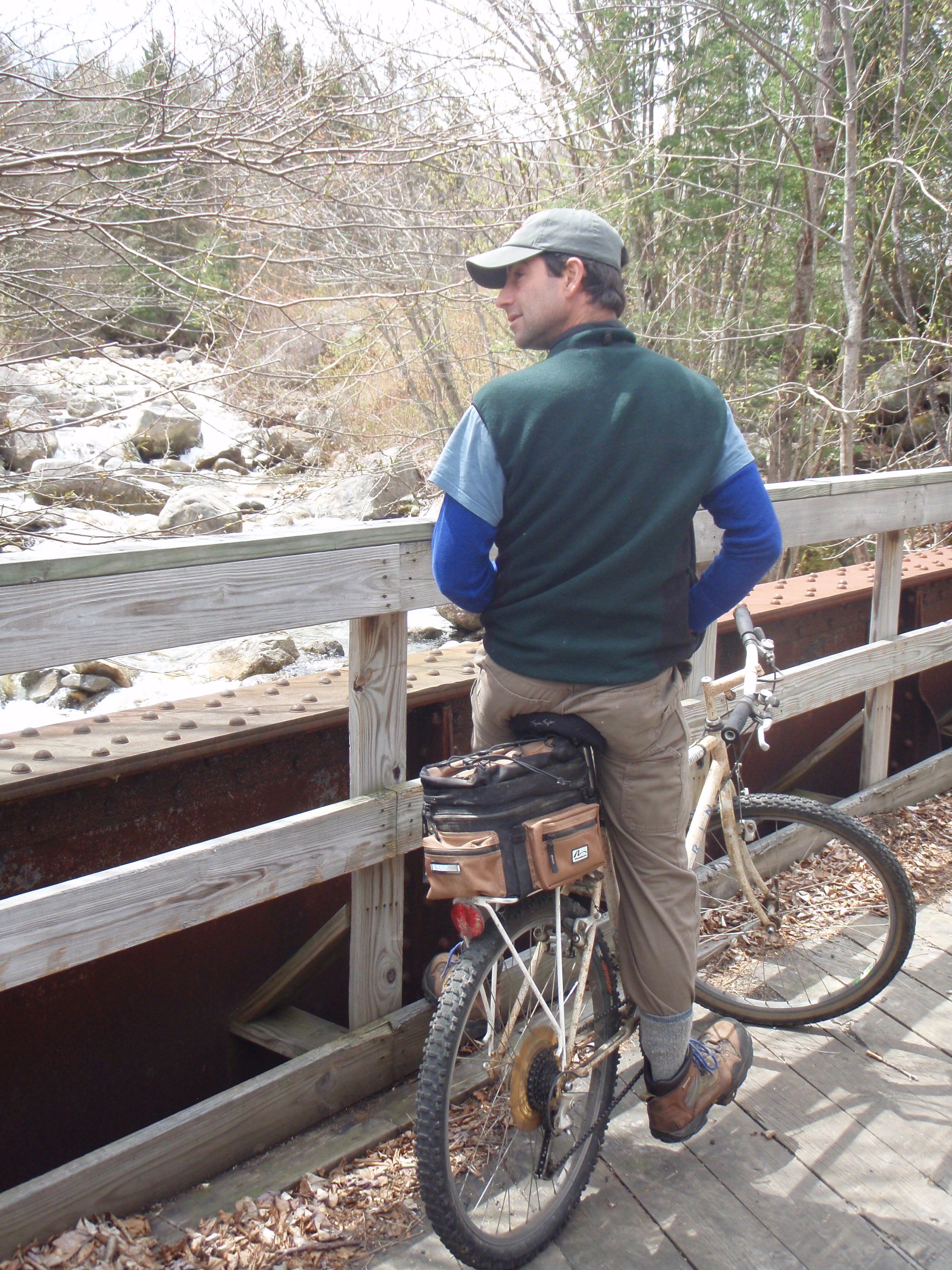Andrew pauses at a bridge on the Presidential Rail Trail.
