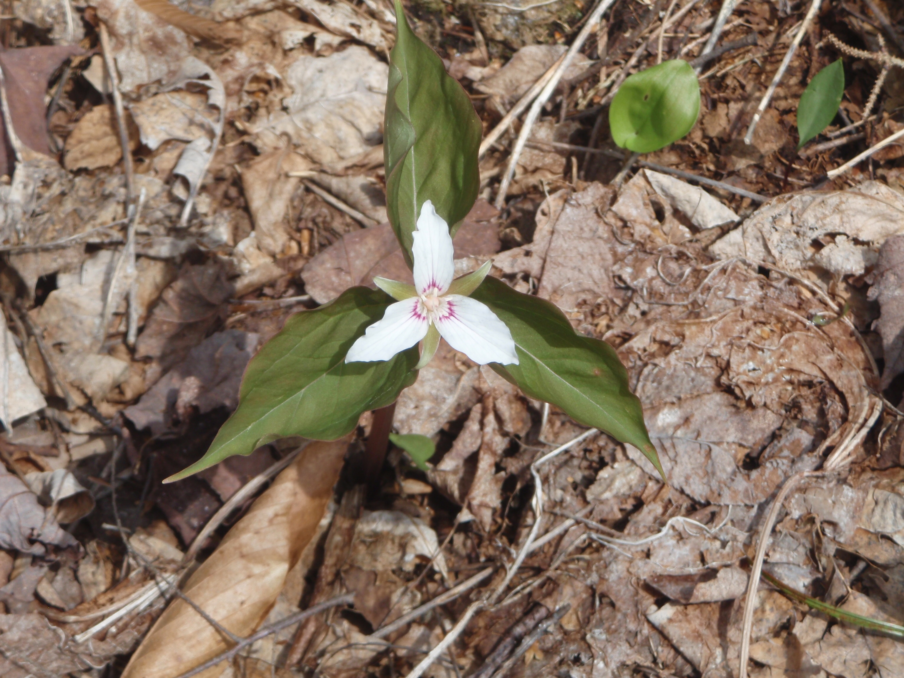 At the next parking area along Route 2 (Castle Hiking Trail), we veered off the rail trail on a side adventure to Rollo Fall.  We biked up the private drive (what Keep Out sign ?) and stashed our bikes behind a tree gate.  The Fall could be seen from a small opening in the forest and we hiked up to it for a better view.  We spooked a woodcock, probably probing the soft ground near the brook for earthworms.   The spring ephemerals were in full bloom: purple and painted trilliums, trout lilies, sessile bellwort, and wood anemone delicately colored the forest floor.