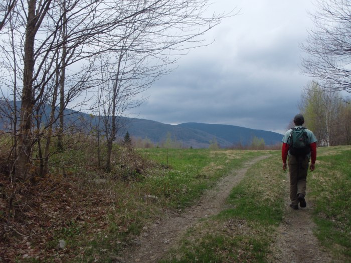 Just a few steps along the woods road we were greeted with an active beaver swamp and lots of birds singing and flitting about.  Lindsay pulled her binnoculars out and we tried to remember distinguishing marks on the brightly colored birds to look up in the bird book later (of course by the time we got home the conversation was: Did it have streaks on the chest and the sides or just the sides?  Do you remember an eye ring?  Obviously, we are still working on our birding skills!)  We continued up the road along a stream with marsh marigold blooming on the banks.  The forest around us was open hardwoods, still not completely leafed out, with purple trillium, spring beauty, trout lily, and dutchman’s breeches blooming in the understory.  We flushed two ruffed grouse, listened to hermit thrush calling (we know that one), and frogs called from a hidden pool.  It’s almost as if everything was singing “We are so happy you are hiking today!”  You know the scene in Roger Rabbit when the cartoon characters are all singing and dancing in their happy little world?  That’s what walking along this trail was starting to feel like.    “We are so happy you are hiking today!”