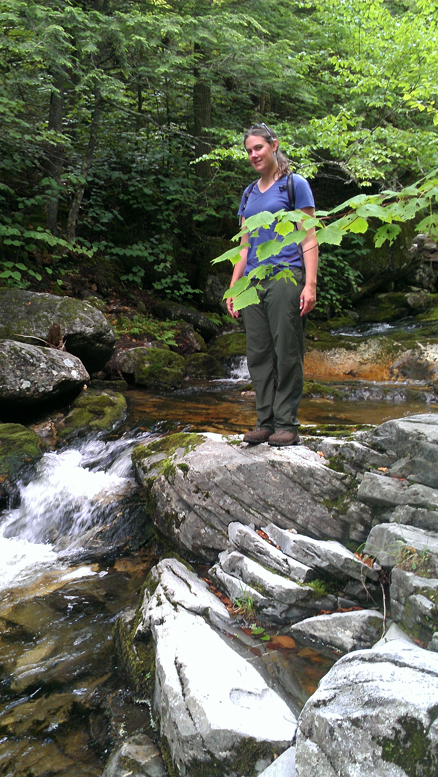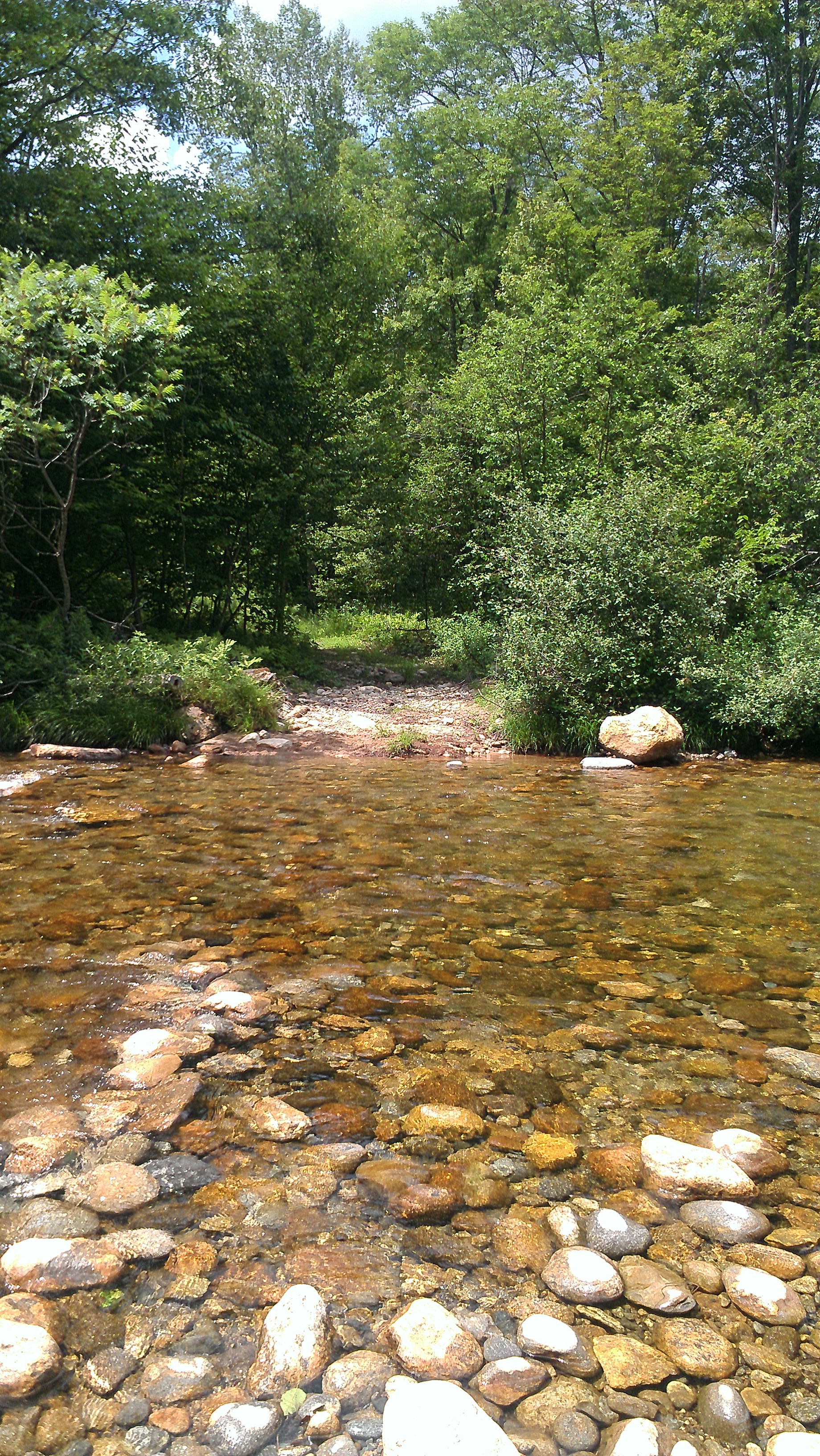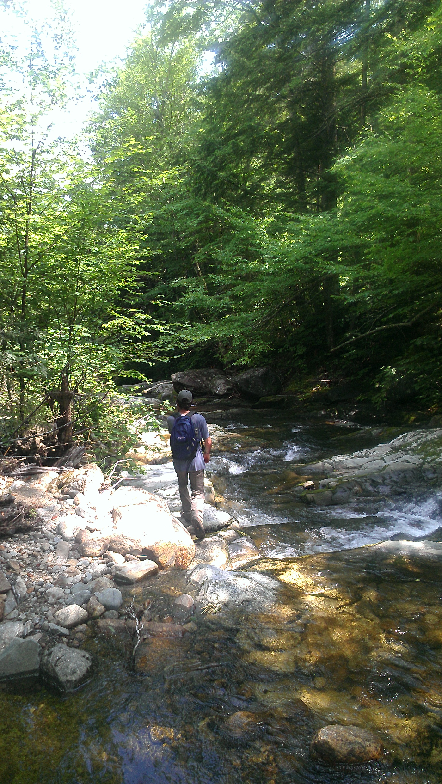 It was a hot day and we felt compelled to stay close to the water and enjoy a break on a ledge island mid-stream. Instead of taking the trail back down we decided to follow the brook back down for a little while. We rock hopped along the edge as best we could, but sometimes we were forced to walk into the woods to get around a cliff.  We were in no rush to get home so we slowly made our way down the brook, stopping often and enjoying ourselves.
