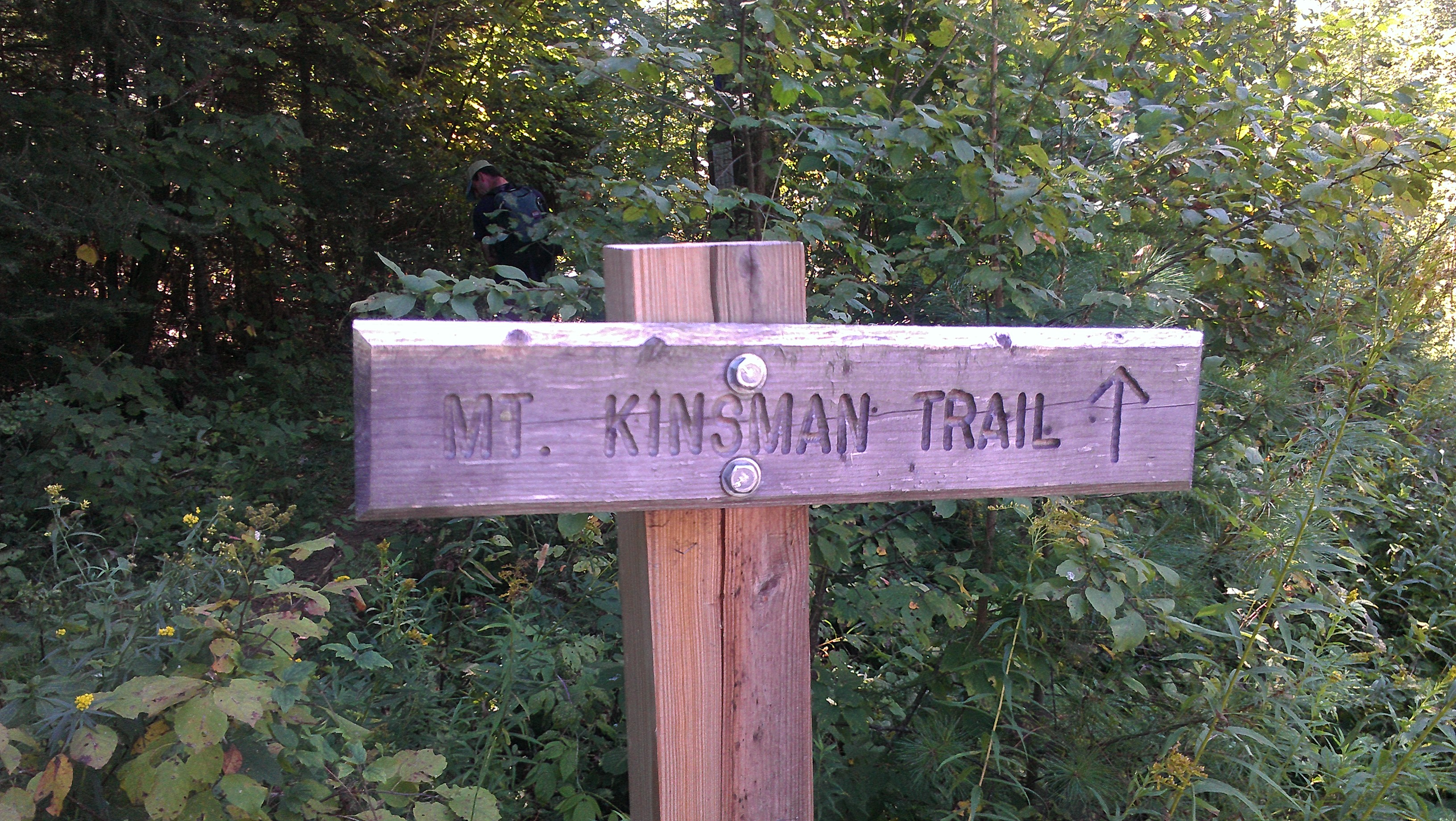 We snuck the map out from underneath Muncy and headed out the door.  Since it was Labor Day weekend, we knew the hiking parking lots would be packed.  As we drove past the Appalachia parking lot, we were glad we weren’t stopping there since it was filled with cars, trucks, and two buses!  We drove through Bethlehem, NH and stopped for a bagel at Maia Papaya and then made our way to the Mount Kinsman Trail.  Our AMC Guidebook said the parking was on the side of the road and the trail started between two stone pillars off of Route 116 at the Franconia/Easton town line.  We found the trail, but did a drive by and good thing we did, because just down the road is a new large parking lot and new trail connector.  Ten other cars were already in the lot but there were still plenty of spaces.
