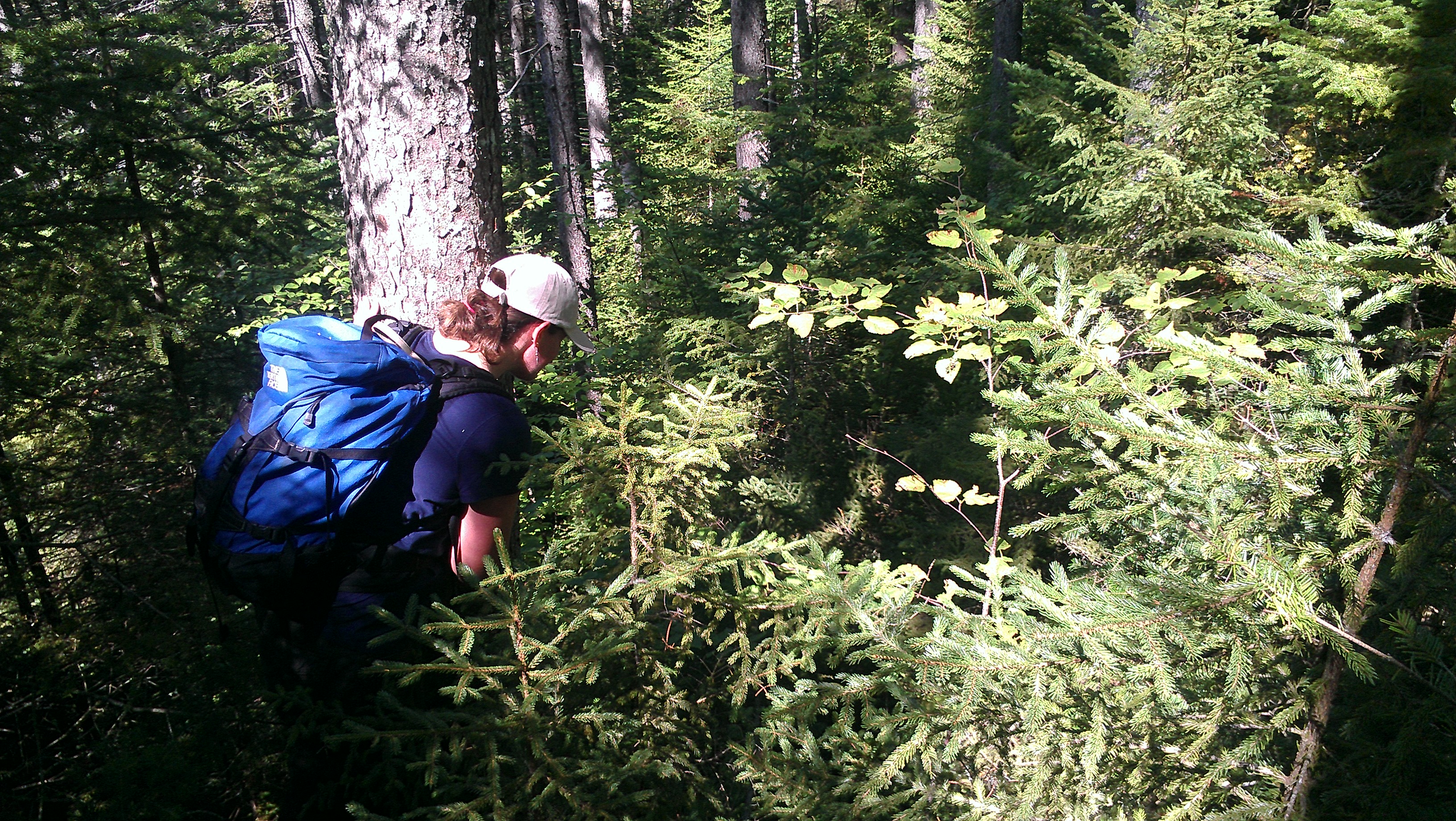 We hiked back up to the main trail.  The Mount Kinsman Trail continues up hill at a moderate pace, and since Lindsay wasn’t feeling 100% and Andrew admitted later that his stomach wasn’t feeling good, we stopped for water breaks more than usual to get up the 3.7 miles to the ridge.  To pass the time, we listened and watched for gliders through the trees. Back down in Bethlehem we had driven past a small airport filled with glider planes.  As we climbed in elevation, we would hear the regular plane overhead come close then disappear, shortly after we would hear a faint whistle and if we looked up we could make out an outline of a glider plane and hear its silent whoosh as it floating through the air.
