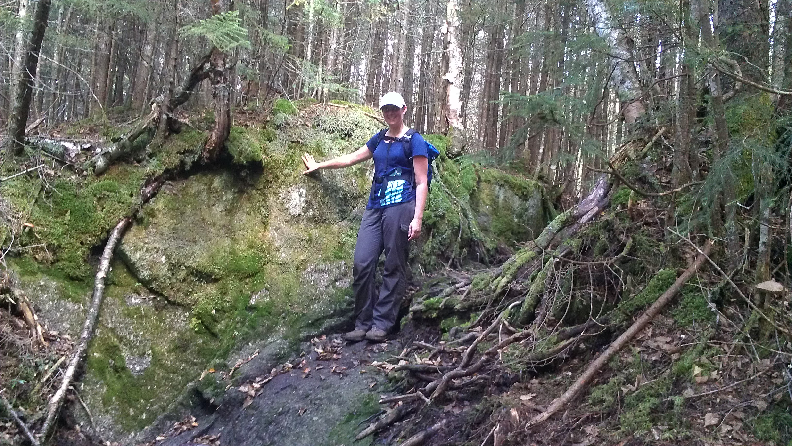 Lindsay sits on the summit rock of North Kinsman Mountain.