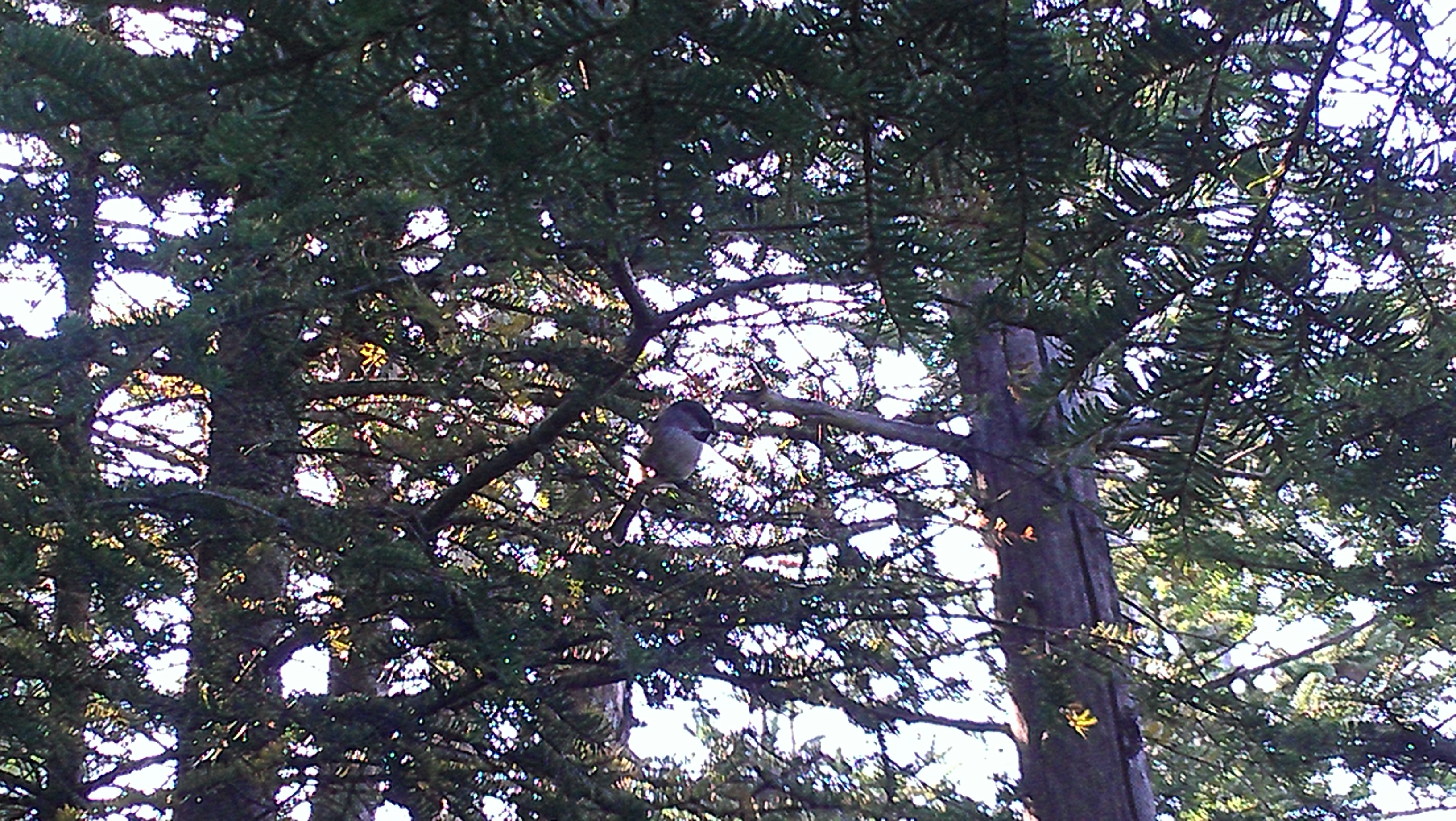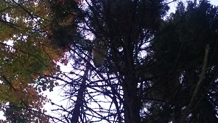Northern saw-whet owl peers down at us as we hike on the trail underneath.
