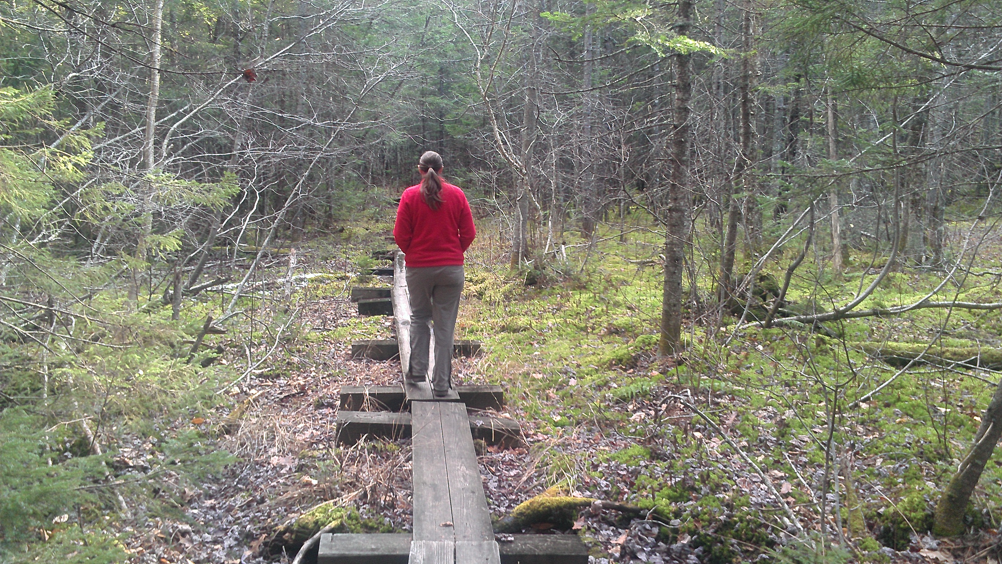 It was a cool day and we hiked along quickly to warm up for the first mile. We passed one hiker and her dog heading back down to the parking lot. The trail was wet in several places and bog bridges helped in the most wet spots.