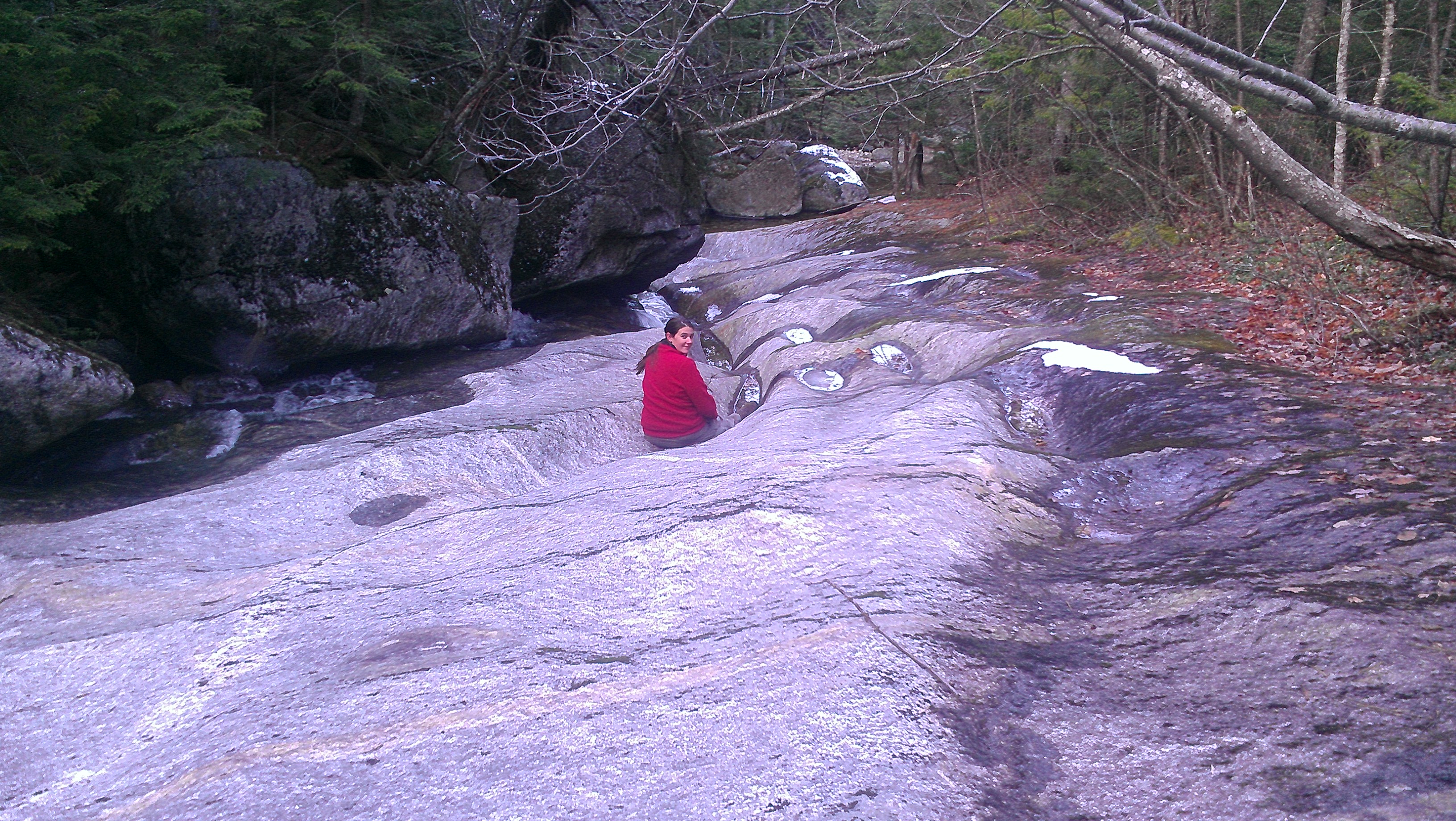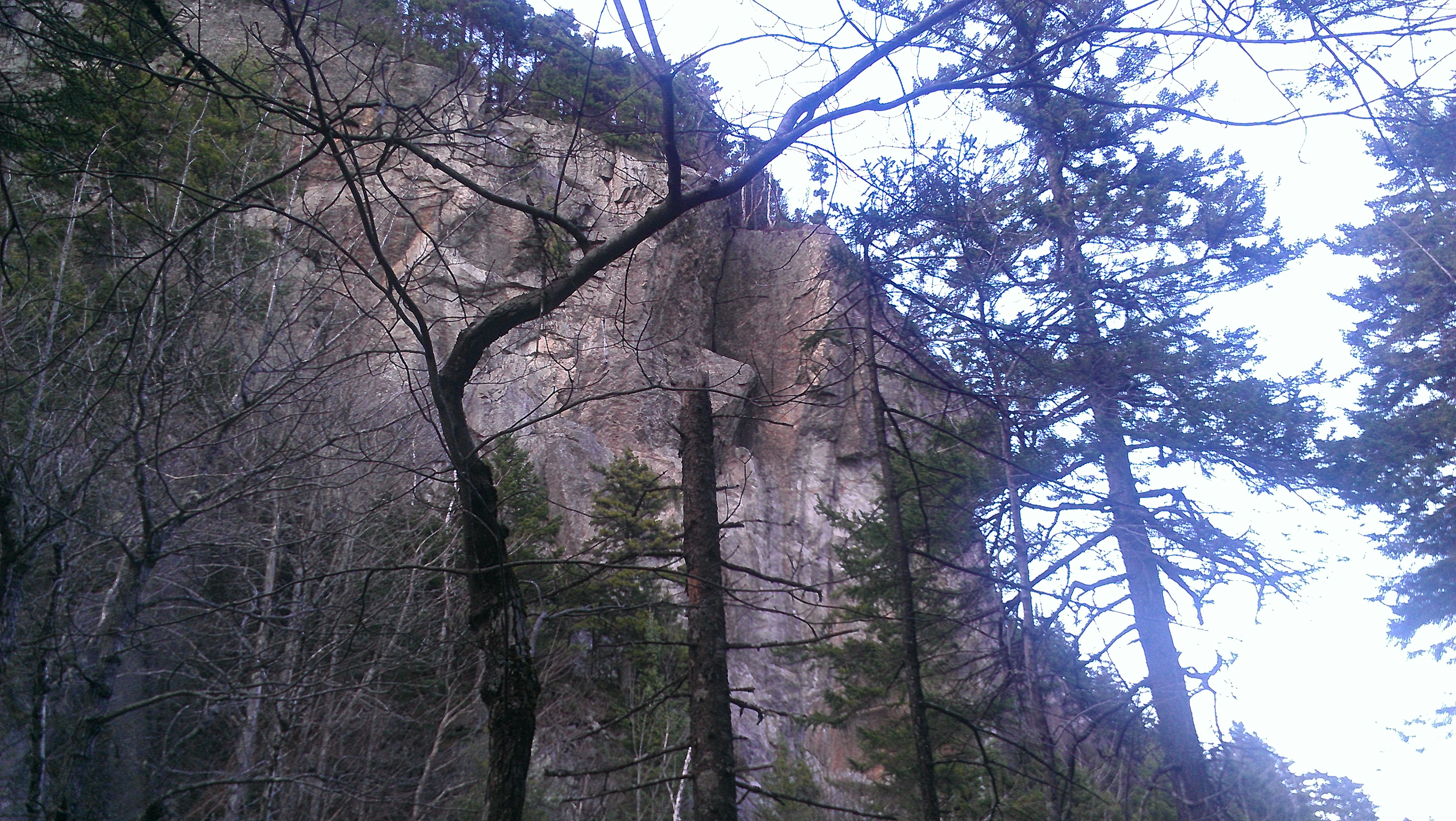 We wanted to go a little further to where “a very striking cliff” looms over the Blue Brook. We found it and it was pretty neat to see. The cliff towered above us, threatening to toss big boulders down.