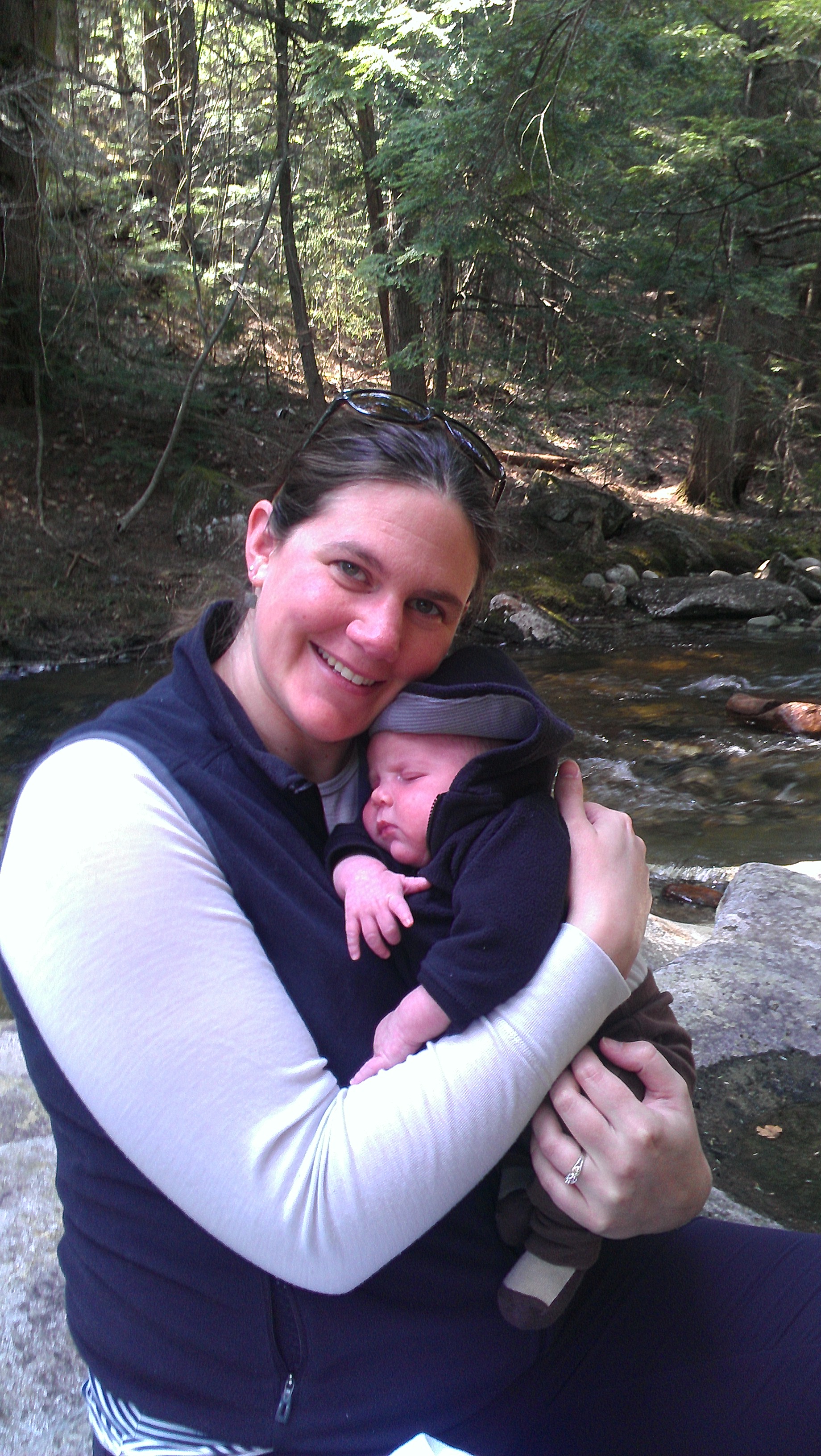 We walked back down the road to the south end of the trail to start our adventure, with Andrew carrying Alden in the Baby Bjorn pack. The trail immediately brings you into a hemlock forest with a rushing brook beside it. It may have been the high we are still on from having a baby or from essentially being cooped up for the past few weeks, but the forest and waterfalls were particularly beautiful.