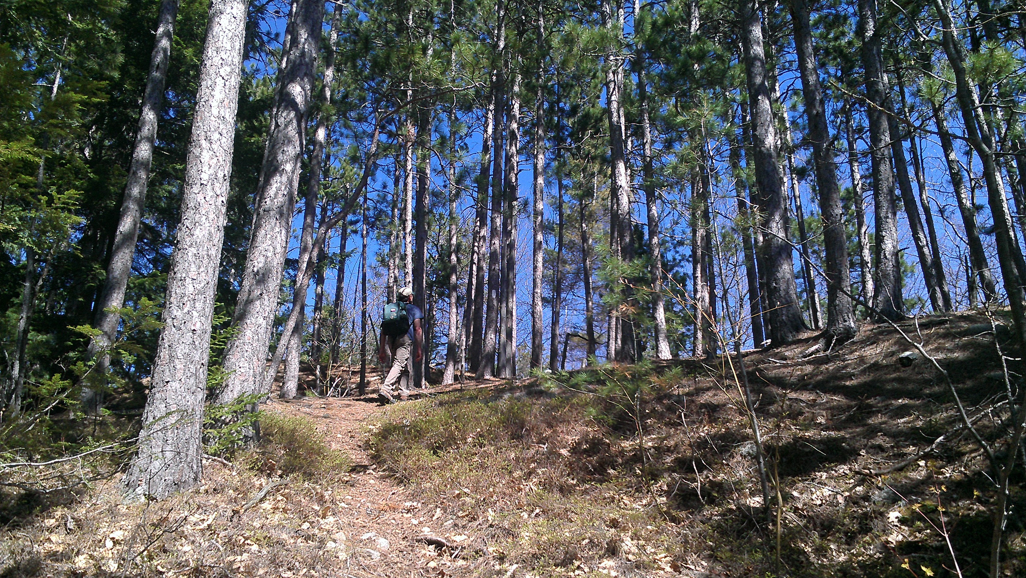 Along the way is a good size vernal pool that had some wood frog eggs. After about 1 mile, the trail veers uphill toward a knoll covered in red pine trees to the Crow’s Nest.