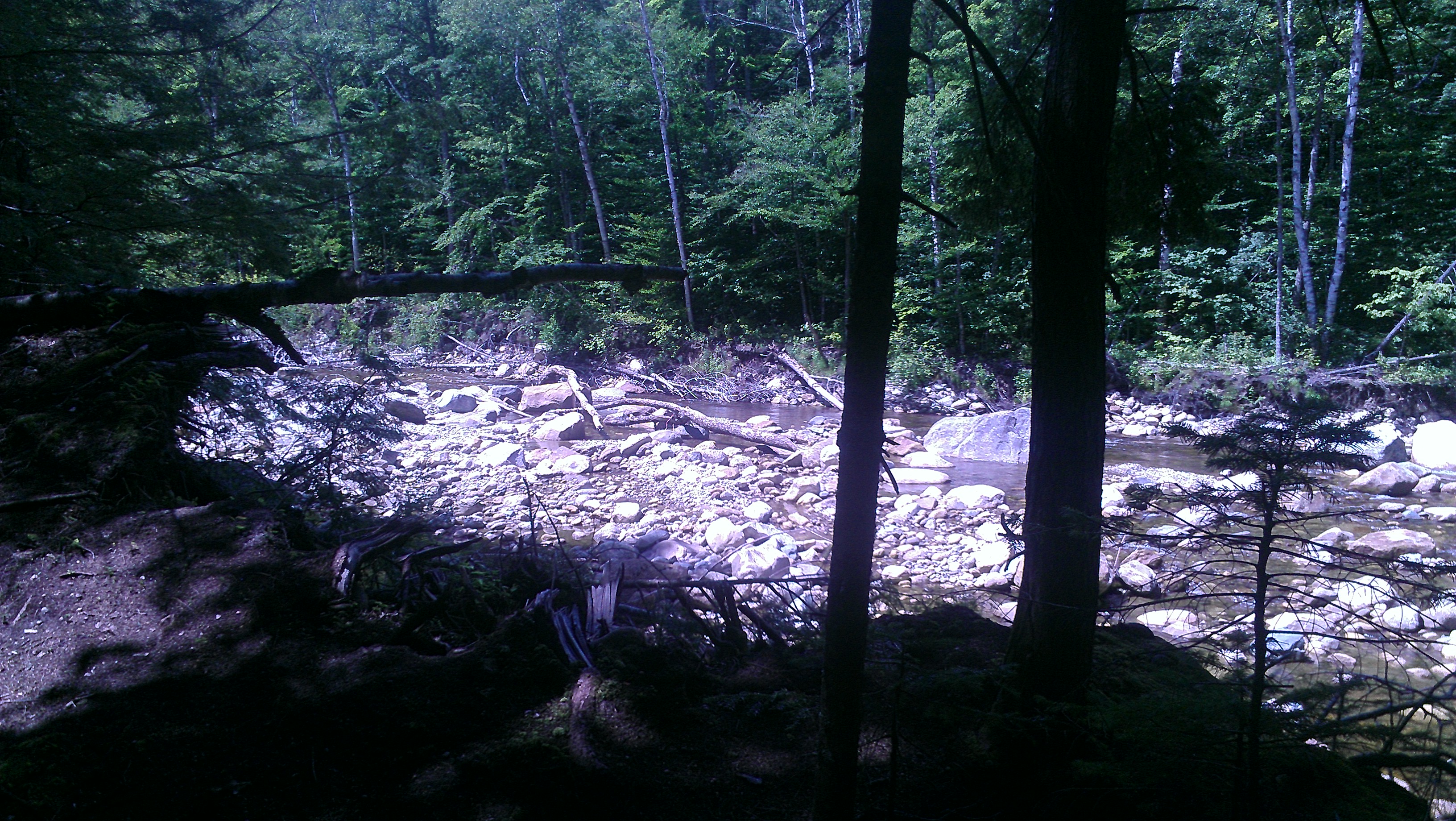 The trail begins behind the kiosk at the parking lot and travels next to the pit toilets down to a small stream and then follows the Wild River. Damage from Hurricane Irene and Tropical Storm Sandy can be seen along the bank of the river and on the trail. The weather was beautiful the day we hiked and several groups were picking their favorite swimming and sunning spots out on the river rocks.