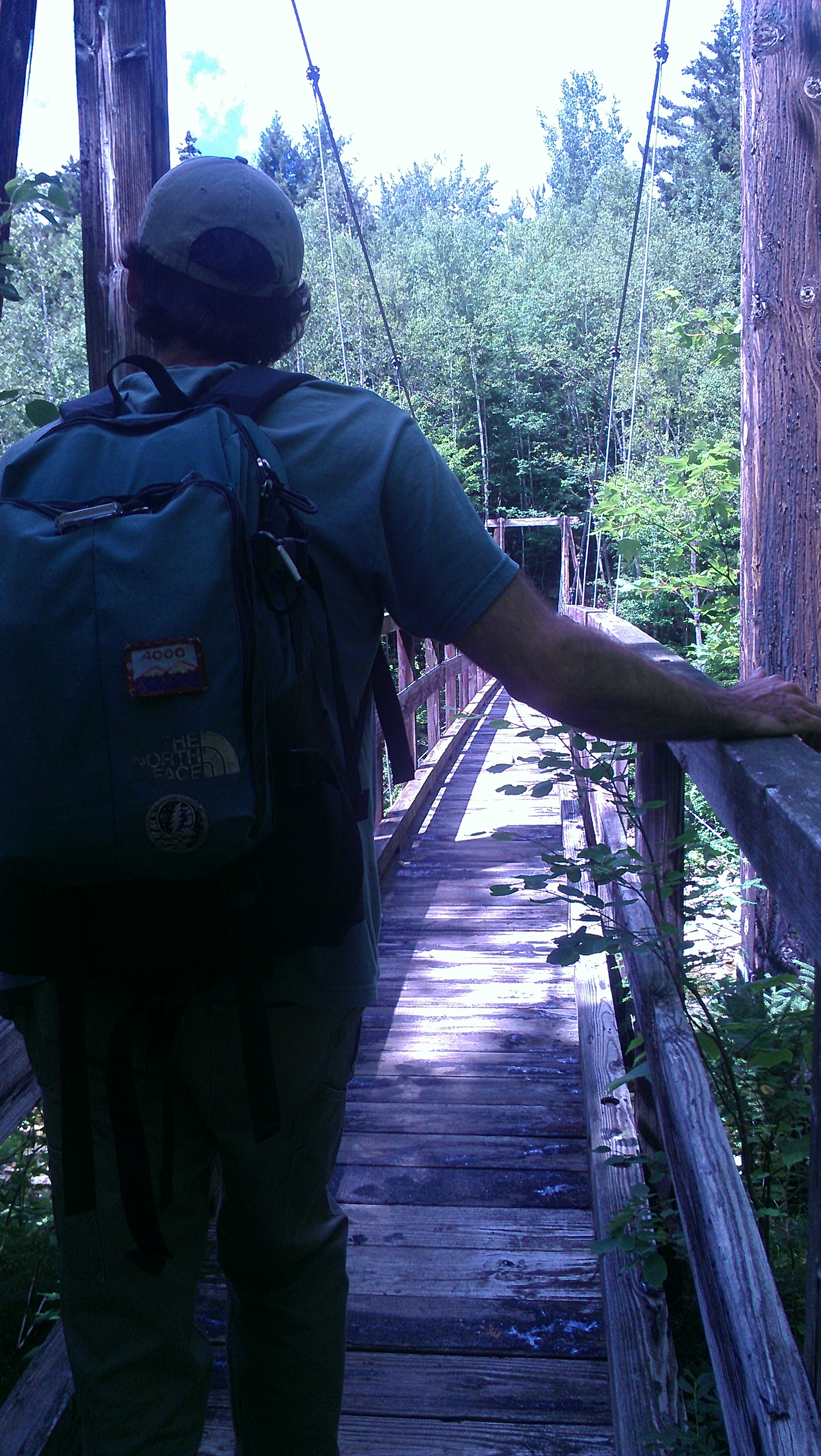 At a junction with the Wild River Trail we took the Moriah Brook Trail that crosses over the Wild River. The old suspension bridge made Andrew nervous to cross it, but Alden loved the view of the water up and down the river.