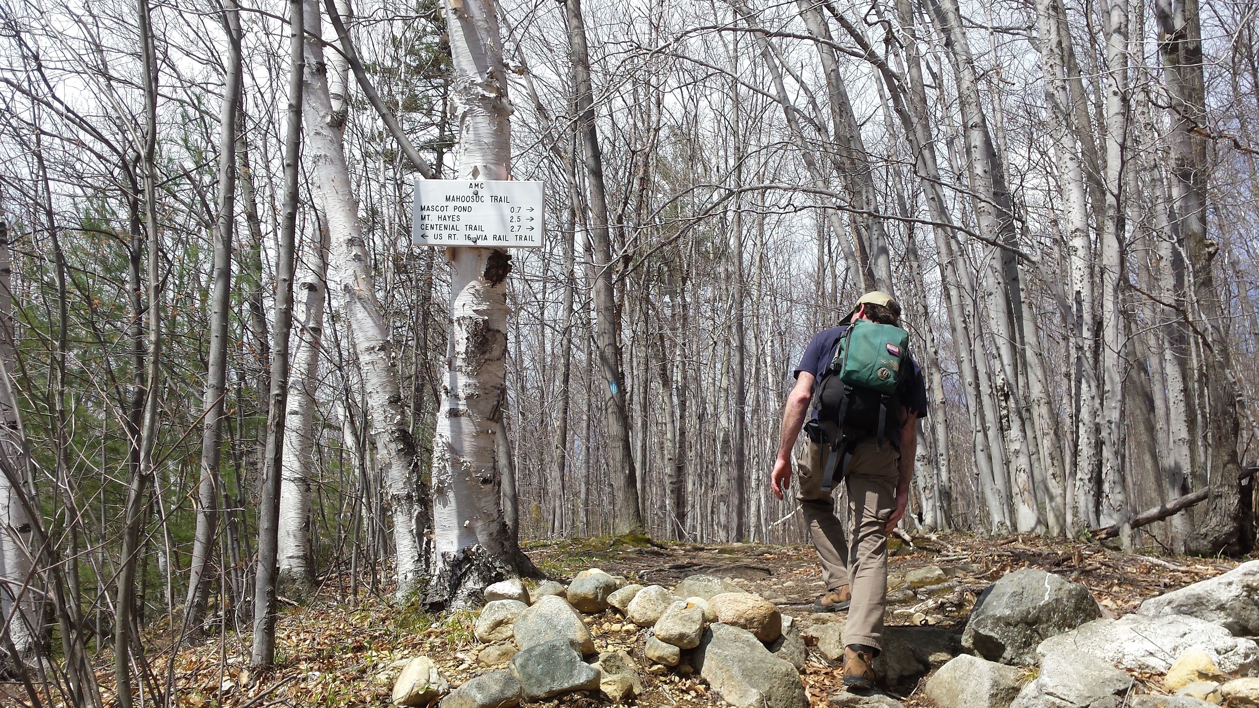 We found the mountain bike trail easily and started hiking on the single track wondering exactly where this would take us. Due to the nature of the mountain bike trails which tend to be very loopy, we thought best to get back on the Mahoosuc Trail since we weren’t entirely sure where the bike trail would lead us. We made our way back onto the railroad grade (hiking trail) and after a short distance we saw where the bike trail came out, realizing that we would’ve ended up in the same place anyway. We made a mental note to take the trail on the way back.