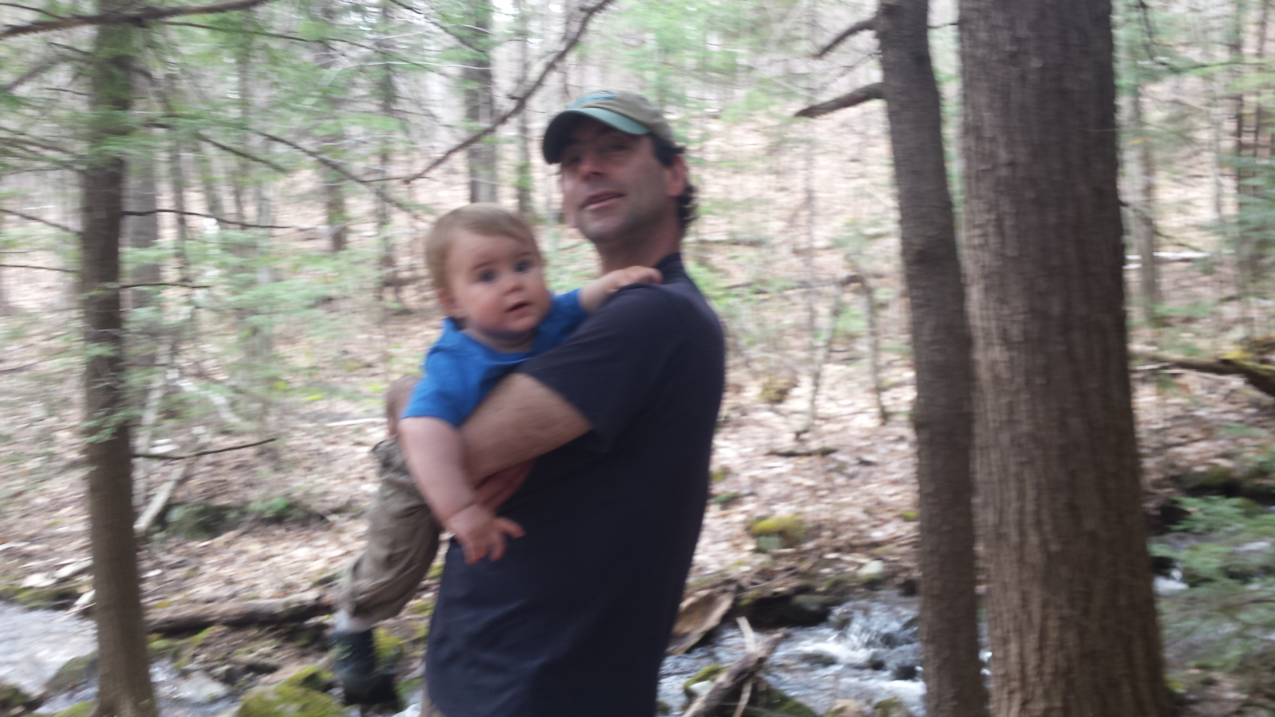 Alden was starting to get antsy so we quickly start heading back and continue up the Mahoosuc Trail to look for a good resting spot. We find a shady spot along a brook and took a break, letting Alden out to explore.