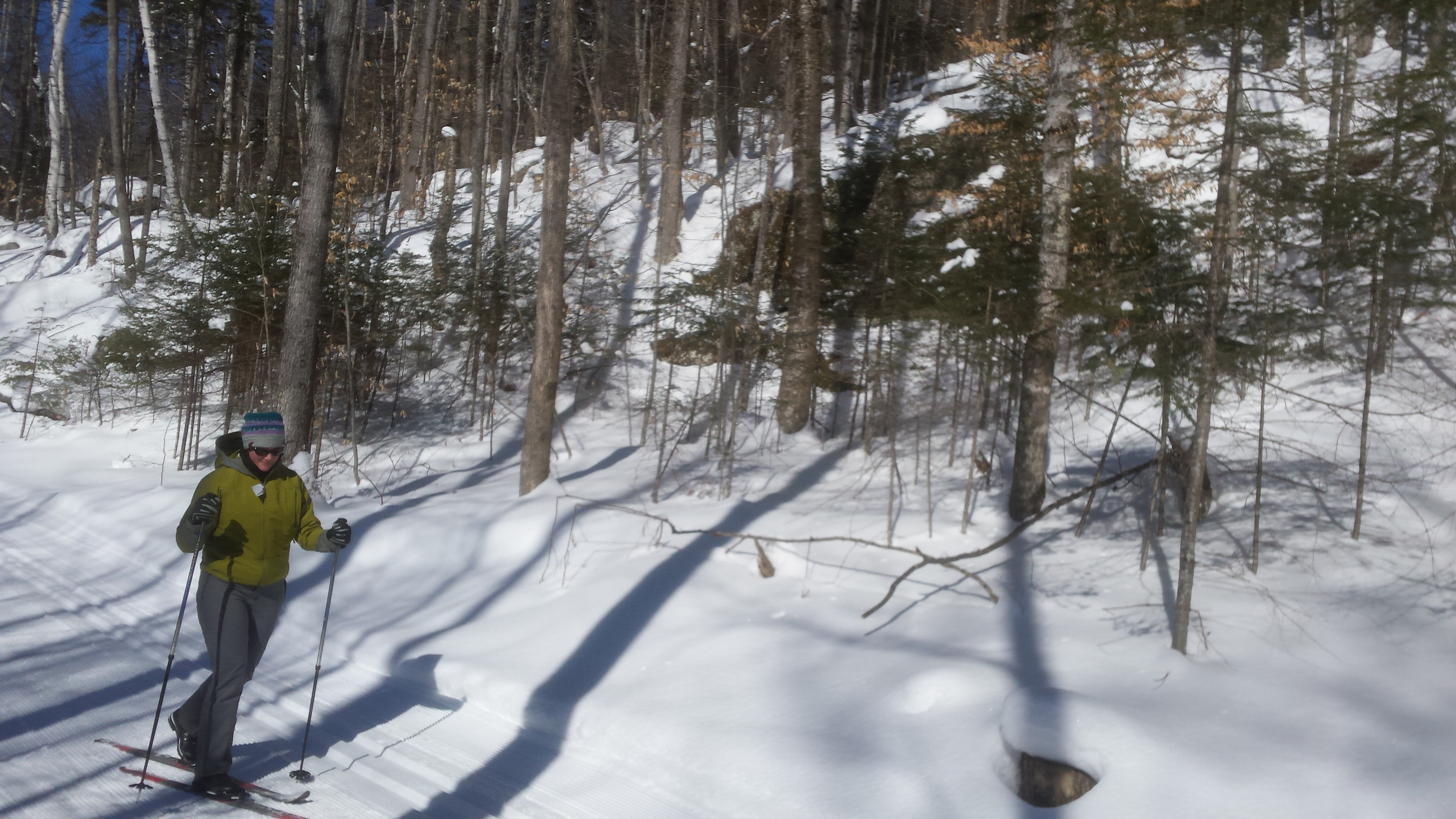 The trails were expertly groomed and we were the first ones to make tracks on these trails on this morning.  As we climbed higher up hill toward the yellow trails the forest changed from a mixed hardwoods and softwoods to a northern hardwood forest.  Even though the temperatures were below zero, the sun shone brightly overhead and we had a wonderful time skiing.