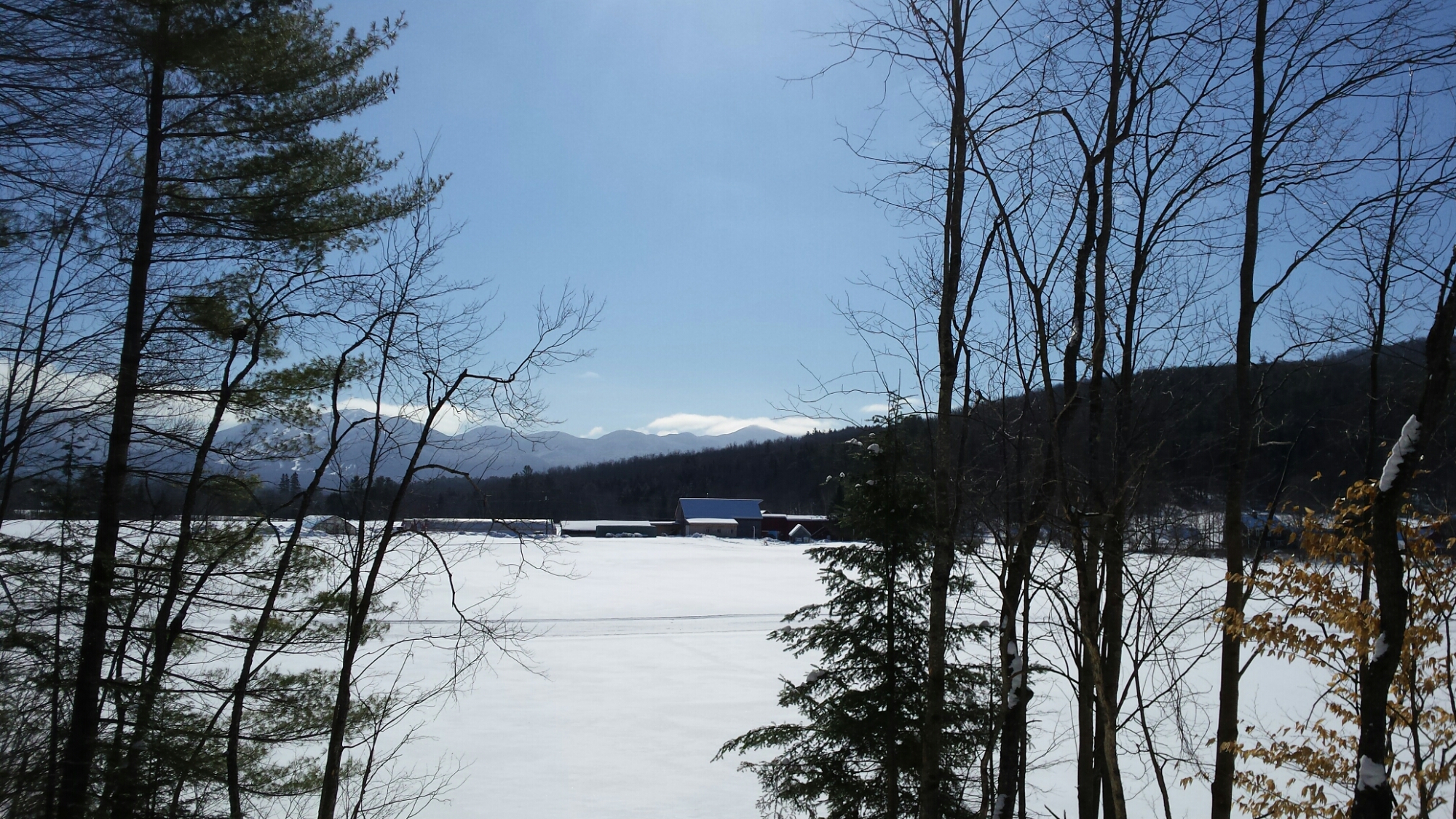 The wonderful view of the Franconia Range and the farm from the Red Trail Loop.