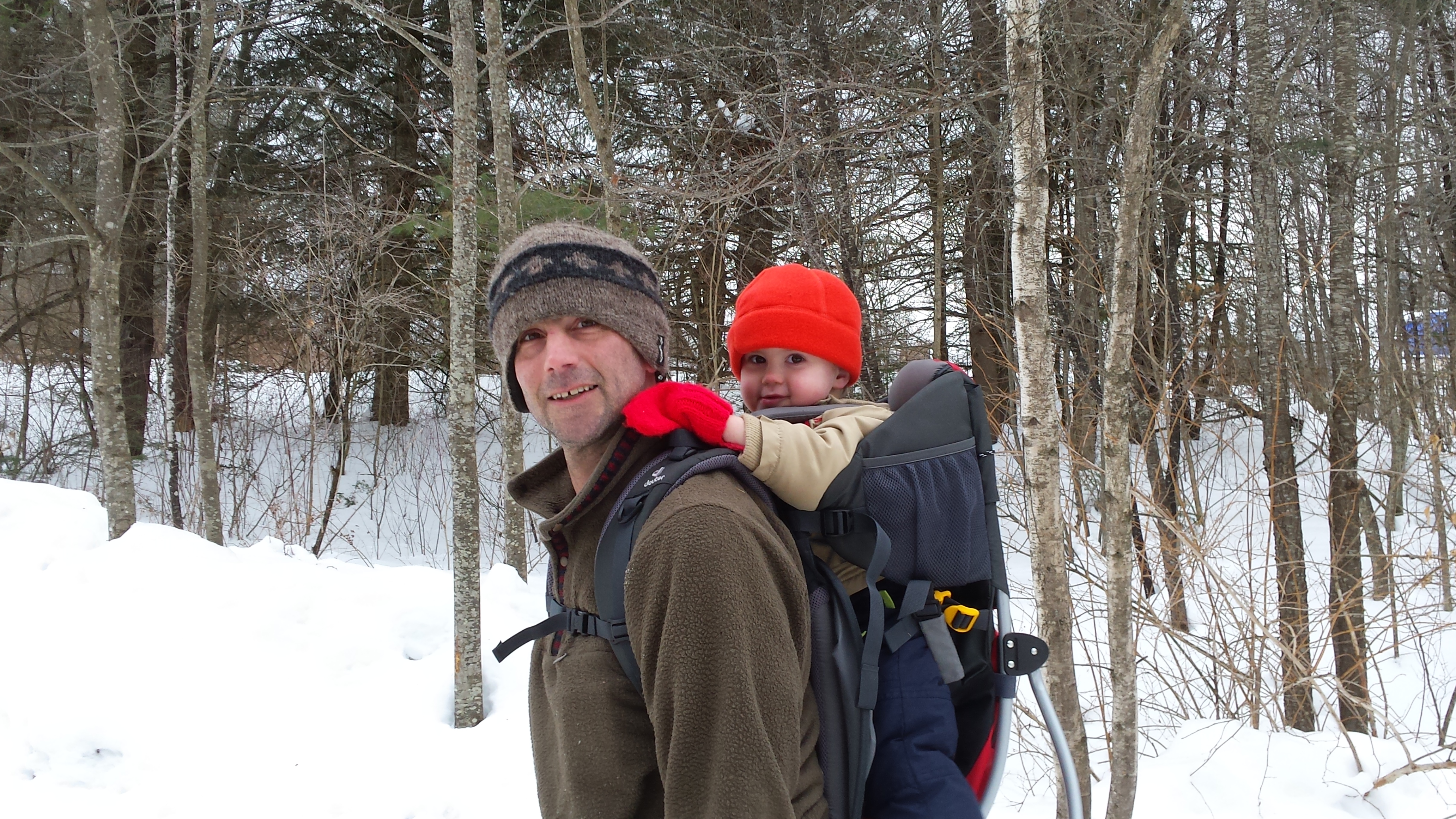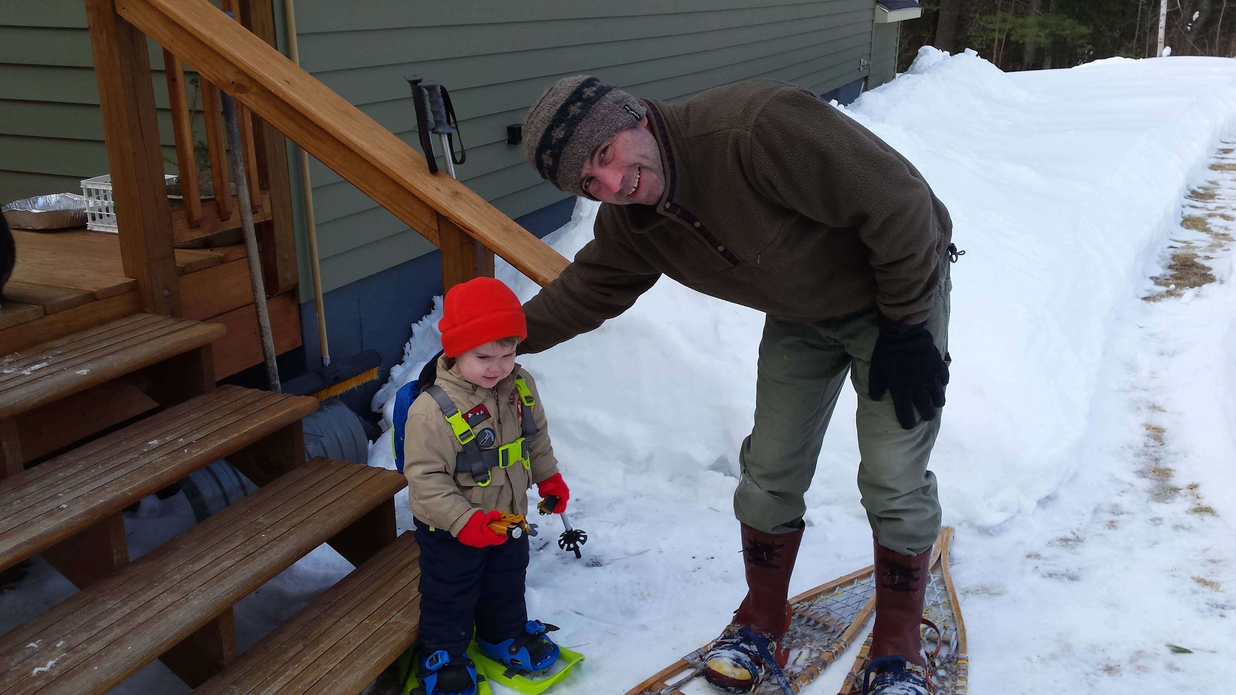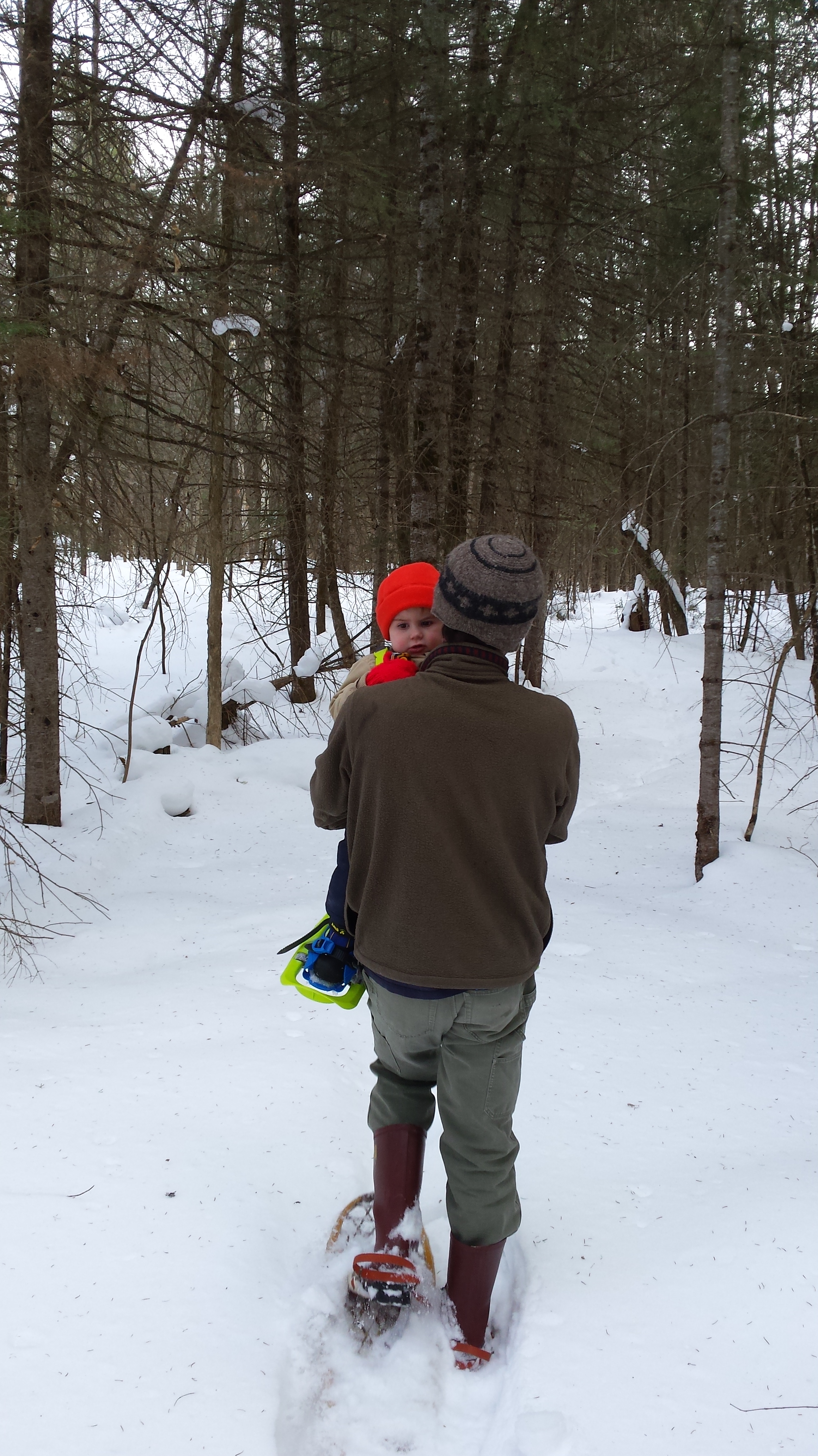 A couple of weekends ago we didn’t travel far to get outside. We just headed into our woods for a short stroll. Prior to this, Lindsay and Andrew put on snowshoes for a short walk in our woods and Alden got upset that he didn’t have a pair of his own. So after several inquiries to friends about hand-me-downs, we ended up buying a pair from LLBean. They are a little big and Alden can’t really walk in them, but he gets excited to put on his own snowshoes. They will be perfect for next winter and maybe the following one too.