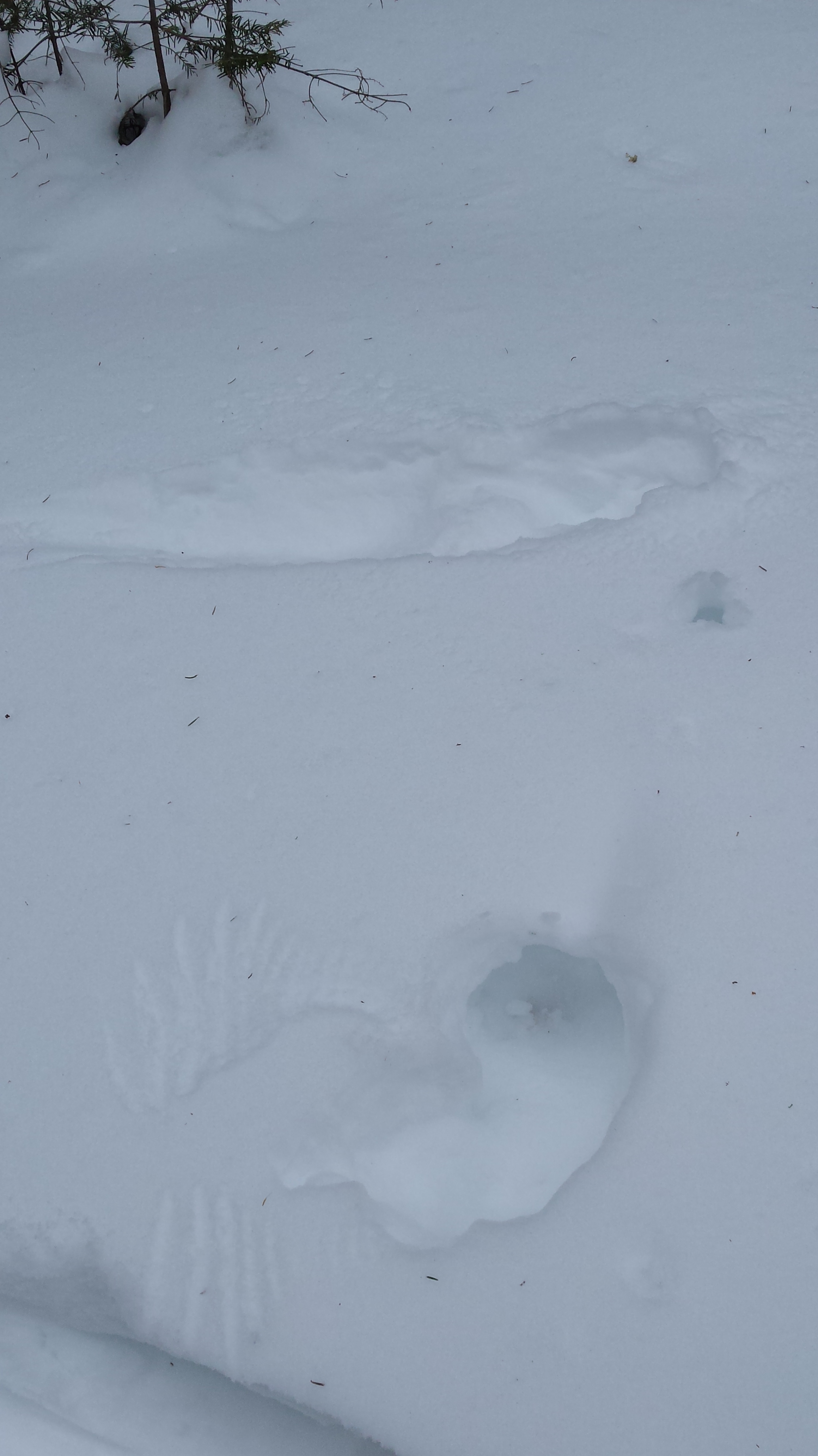 In addition to finding sign of red squirrel, deer, and mouse, the coolest sign was multiple ruffed grouse nocturnal snow roosts. You can see in the photos below how the grouse tunneled under the snow to keep warm overnight and with a flap of the wings took off in the morning. A couple of the roost sites we also could see walking tracks and scat.