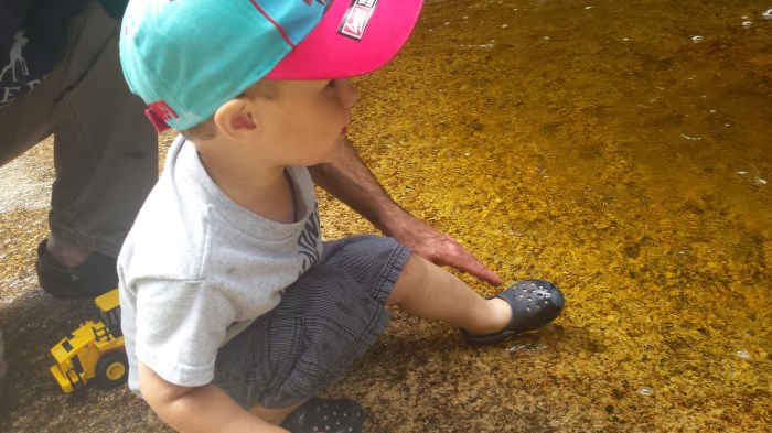 Alden didn’t mind hanging out in the backpack carrier and enjoyed looking at the waterfalls.  He was particularly interested in the “tiny waterfall” and collecting small nature items in his net.