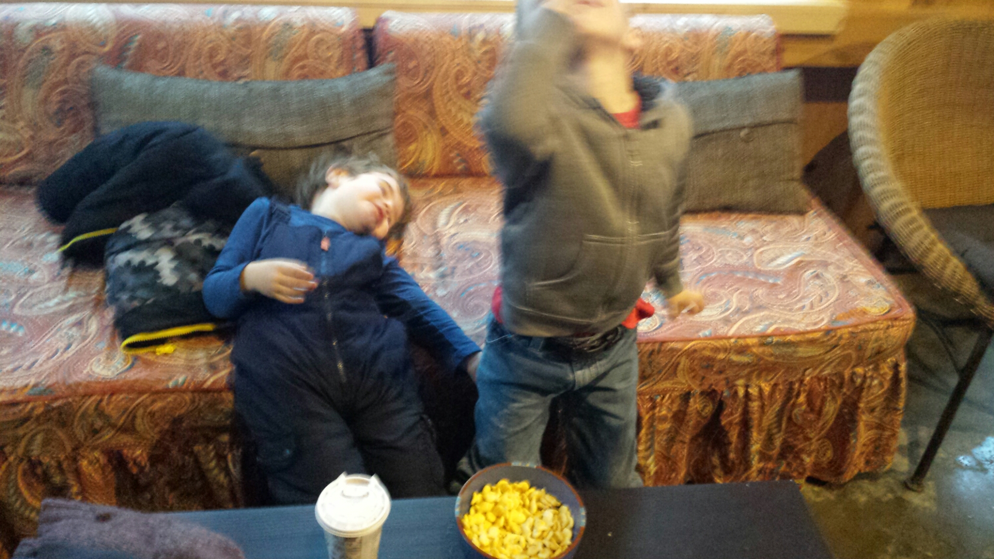 Back down at the warming hut we took advantage of the wood stove heat and hot chocolate. Alden made a new friend and the two were goofy kids eating goldfish, sipping hot chocolate, and flopping around on the cozy couch.