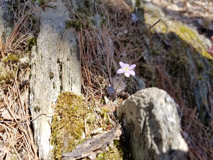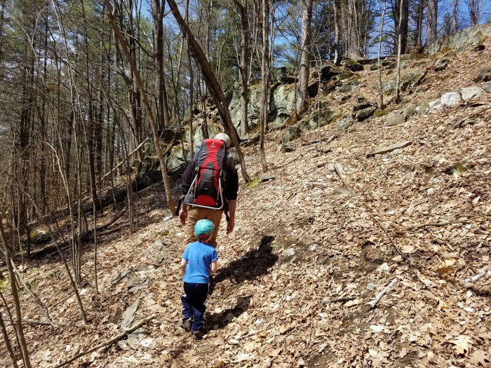 Andrew thought this would be a good hike for early spring since it is south-west facing and would likely be snow-free and dry. He was right, the woods were dry with white oaks and white pine, the forest floor blanketed with orange and brown leaves, and the occasional hepatica with a small pinch of purple.
