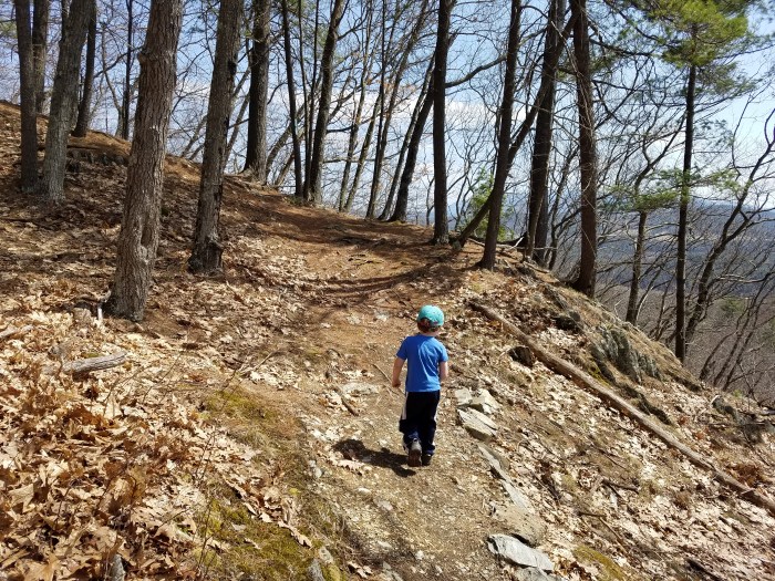 As the trail continued upward in elevation we ran into another hiker and her excited dog. The trail swings close to a drop off with pine trees ringing the edge of the cliff. The strong wind at this point along with the steep drop-offs made both the boys to be a little scared, but Lindsay urged them onward. Andrew was especially nervous since the forest floor and trail were covered in a layer of extra-slippery oak leaves and pine needles, and Alden was eager to hike ahead and explore; they worked it out that Alden would hold Andrew’s hand so daddy wouldn’t be so scared. We stopped just before the last push to the top for a quick snack break.