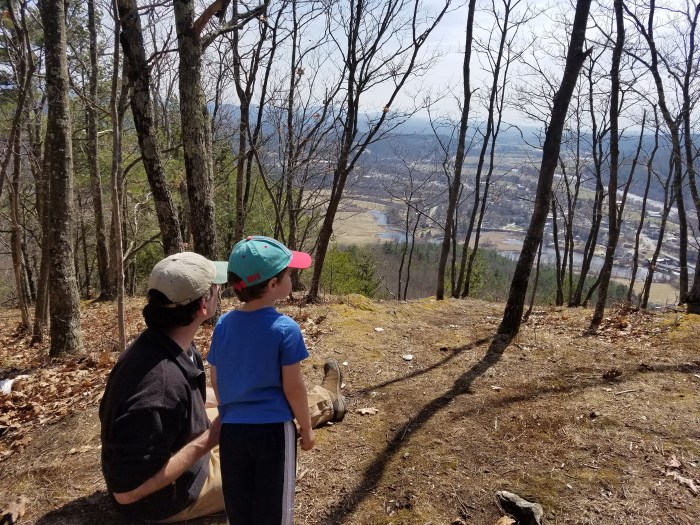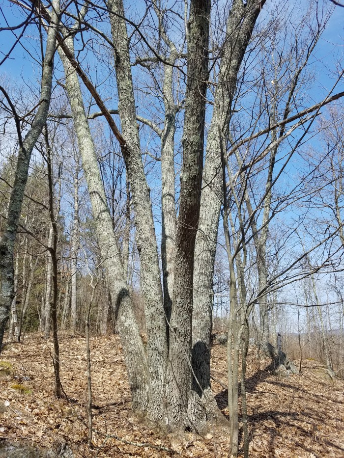 The final steepest push up the trail started with rock steps and dramatic long switchbacks, in between oak trees and red pines that eventually levels out onto the ridgeline. At the top there is an impressive multi-trunked oak, but the old lone oak stands at a viewpoint toward Haverhill (and Vermont). We enjoyed the view down toward the Ammooscuc River and Connecticut River. Behind us on the horizon through the trees, you could make out some of the White Mountains to the east.