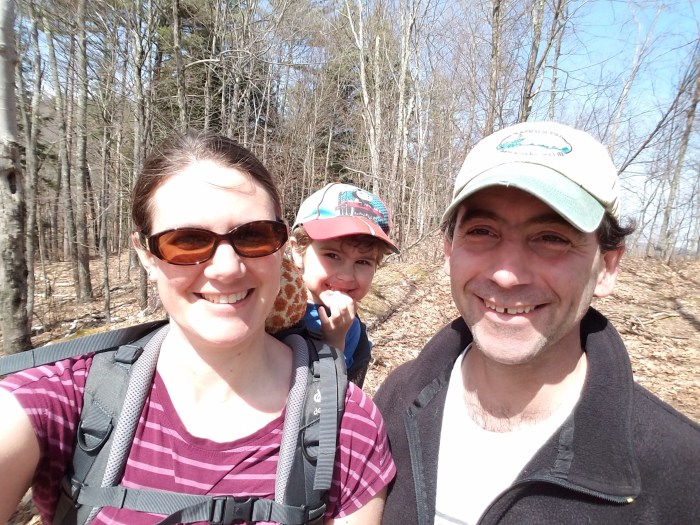 Last weekend, Andrew found a fun place for all of us to hike that he remembered reading about on 1 Happy Hiker’s blog: Lackie Lone Oak Trail. This private property is under conservation easement with the Upper Valley Land Trust in Bath, NH. There is parking for 1-2 cars off Abbott Ave (which is off of 135) next to the confluence of the Ammonoosuc and Connecticut Rivers, just outside of bustling downtown Woodsville. A map of the trails can be found here.