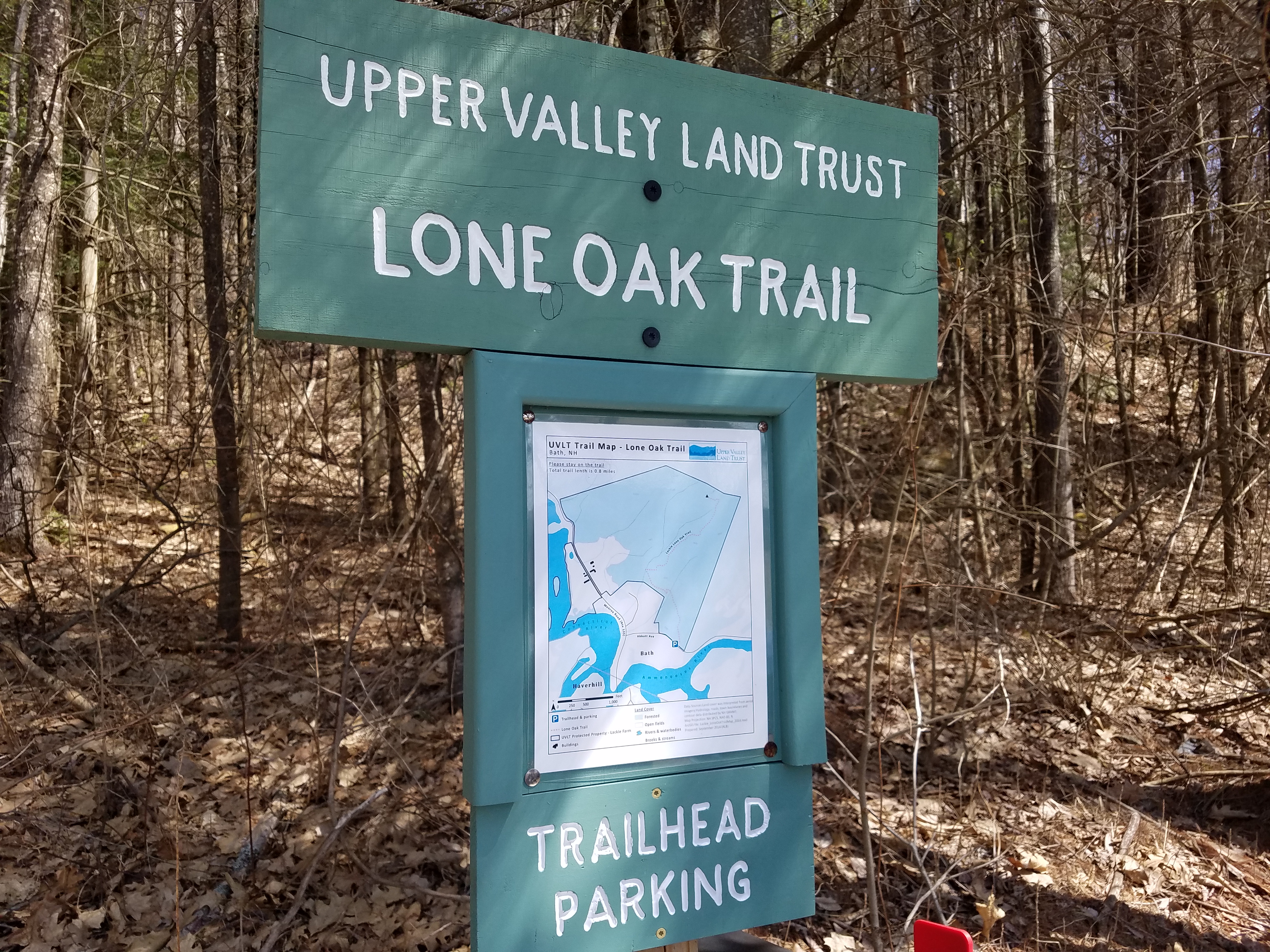 Last weekend, Andrew found a fun place for all of us to hike that he remembered reading about on 1 Happy Hiker’s blog: Lackie Lone Oak Trail. This private property is under conservation easement with the Upper Valley Land Trust in Bath, NH. There is parking for 1-2 cars off Abbott Ave (which is off of 135) next to the confluence of the Ammonoosuc and Connecticut Rivers, just outside of bustling downtown Woodsville. A map of the trails can be found here.
