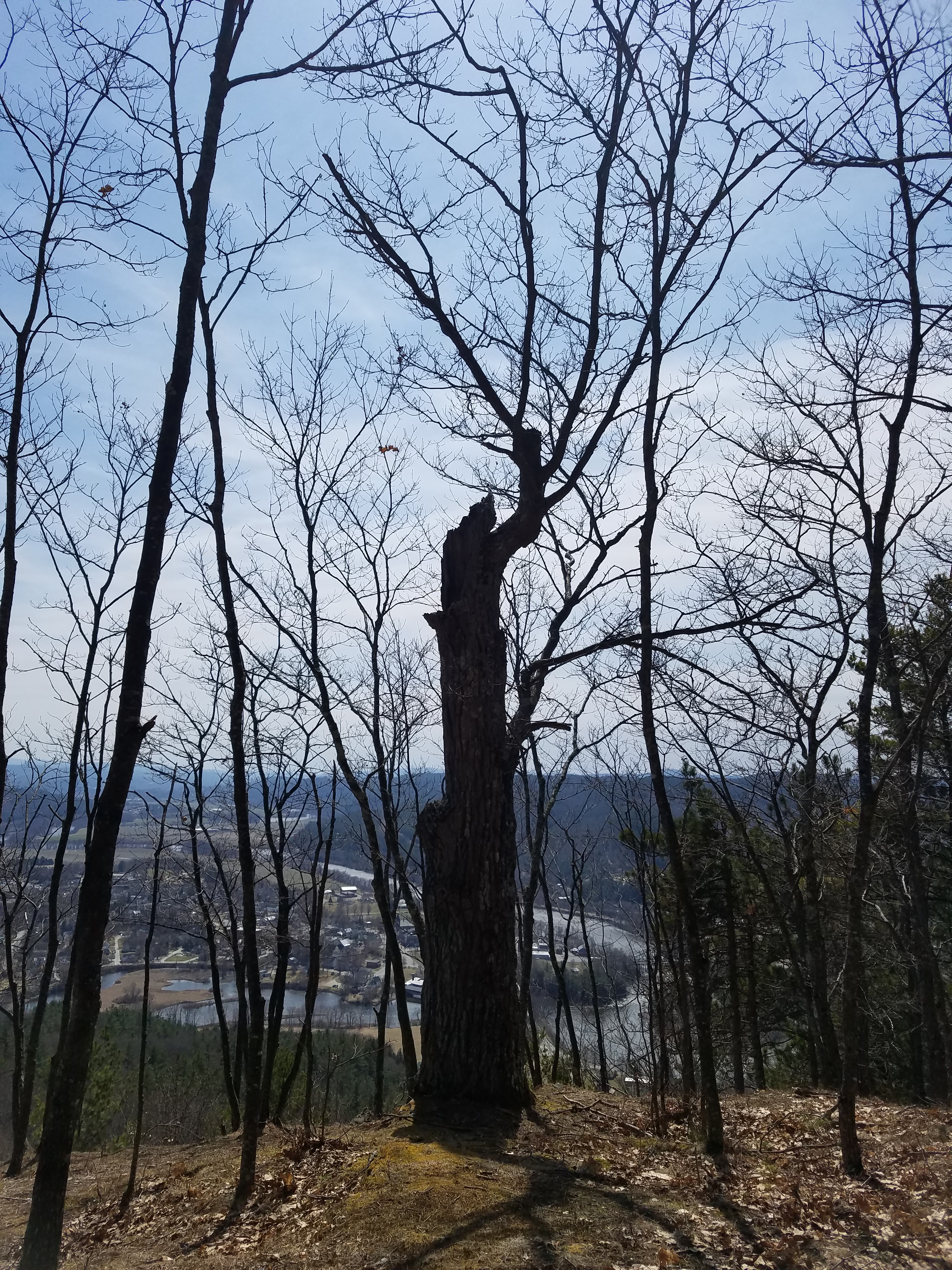 The final steepest push up the trail started with rock steps and dramatic long switchbacks, in between oak trees and red pines that eventually levels out onto the ridgeline. At the top there is an impressive multi-trunked oak, but the old lone oak stands at a viewpoint toward Haverhill (and Vermont). We enjoyed the view down toward the Ammooscuc River and Connecticut River. Behind us on the horizon through the trees, you could make out some of the White Mountains to the east.