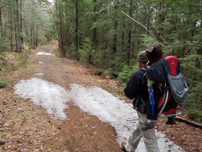 The beginning of the trail has some major damage (from Hurricane Irene??), but other than that the wide woods road trail is an easy uphill hike. The private land to the north is an active maple sugar bush with impressive sap lines and a small sugarhouse just off the trail.