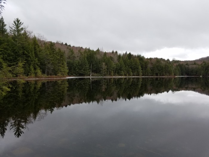 Eventually the trail leads away from the woods road and downhill slightly toward Peaked Hill Pond which is partly bordered by private land. Luckily the place looks like it doesn’t get too many visitors. We picked up some trash and carried it out, hoping that others will do so to make sure this place stays open to the public.