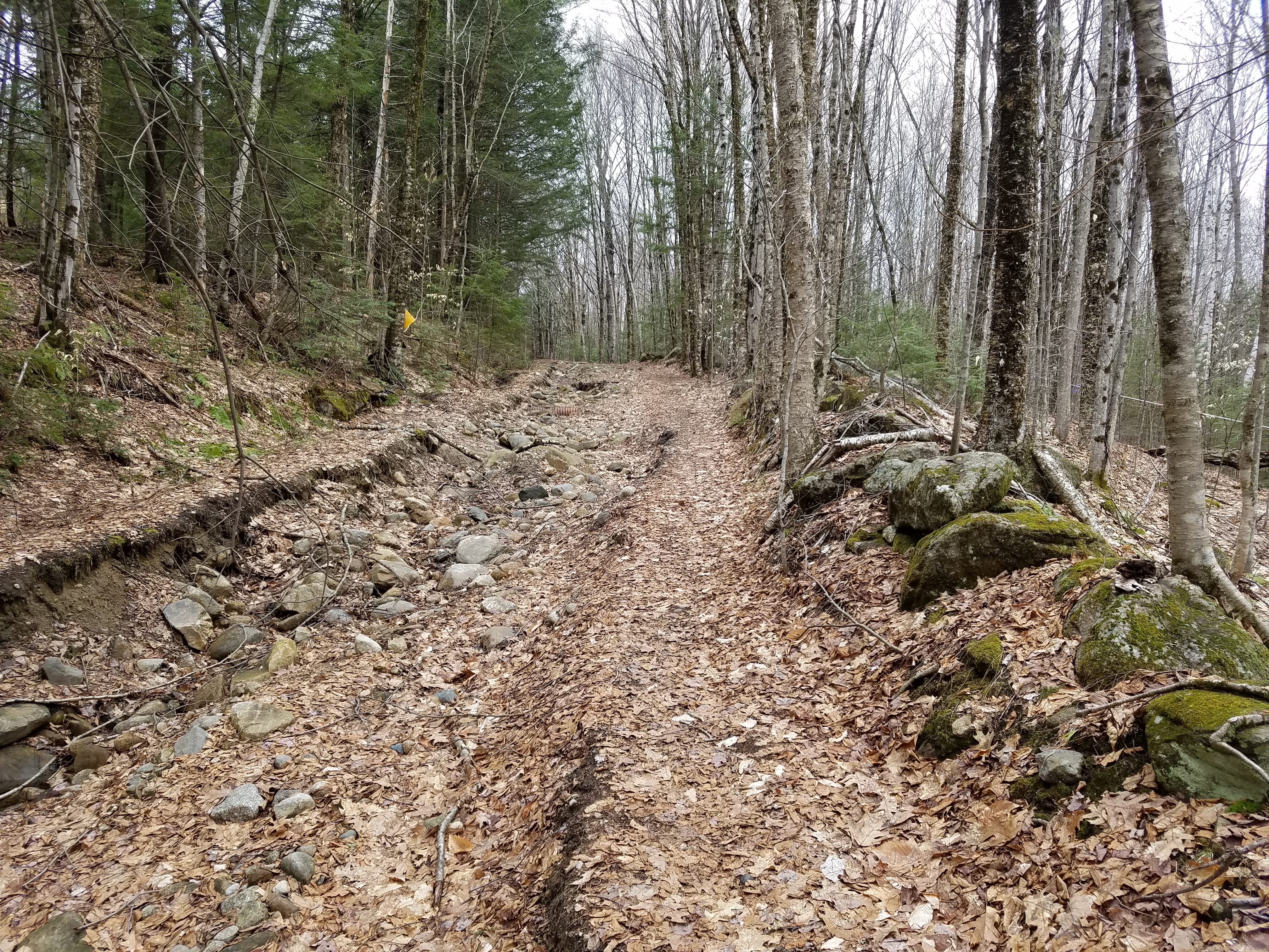 The beginning of the trail has some major damage (from Hurricane Irene??), but other than that the wide woods road trail is an easy uphill hike. The private land to the north is an active maple sugar bush with impressive sap lines and a small sugarhouse just off the trail.