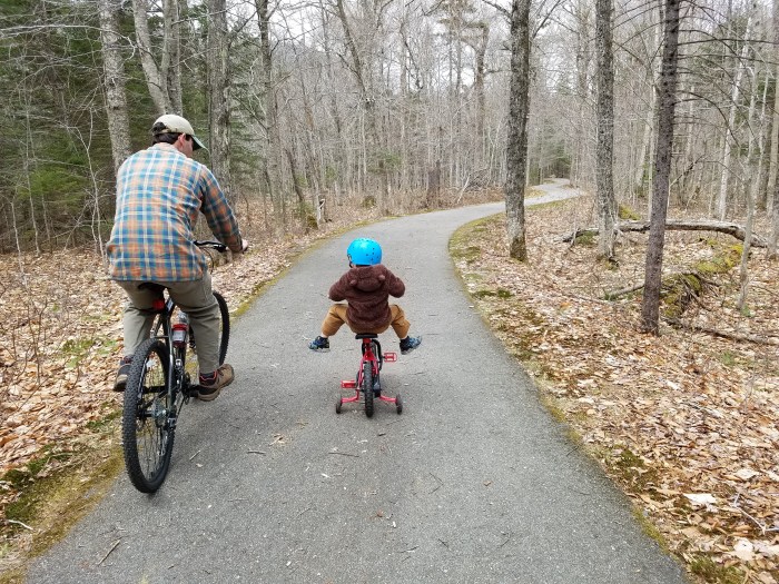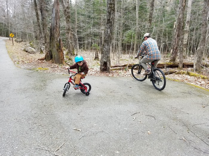 Last weekend we wanted to go for a bike ride. Alden has, just this spring, figured out how much fun bike riding is and we wanted to give him the experience of riding a long distance, instead of just circling around in our dirt driveway. He hasn’t quite mastered going down hills and using his brakes, so we picked a mostly flat section of the paved bike path in Franconia Notch State Park in Franconia, NH.