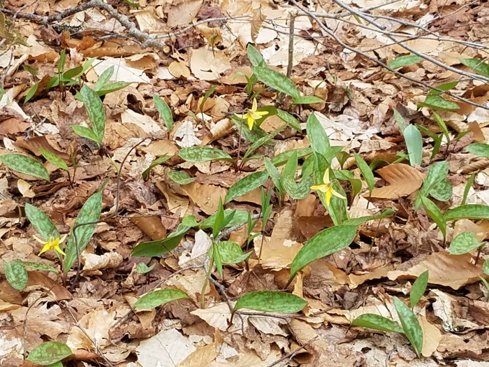 We crossed over several bridges as we headed south and the forest changed to an all hardwood forest with purple trilliums and trout lily’s flowering in the open forest floor. The leaves haven’t completely come out yet, so there was plenty of light filtering down to reach these delicate flowers.