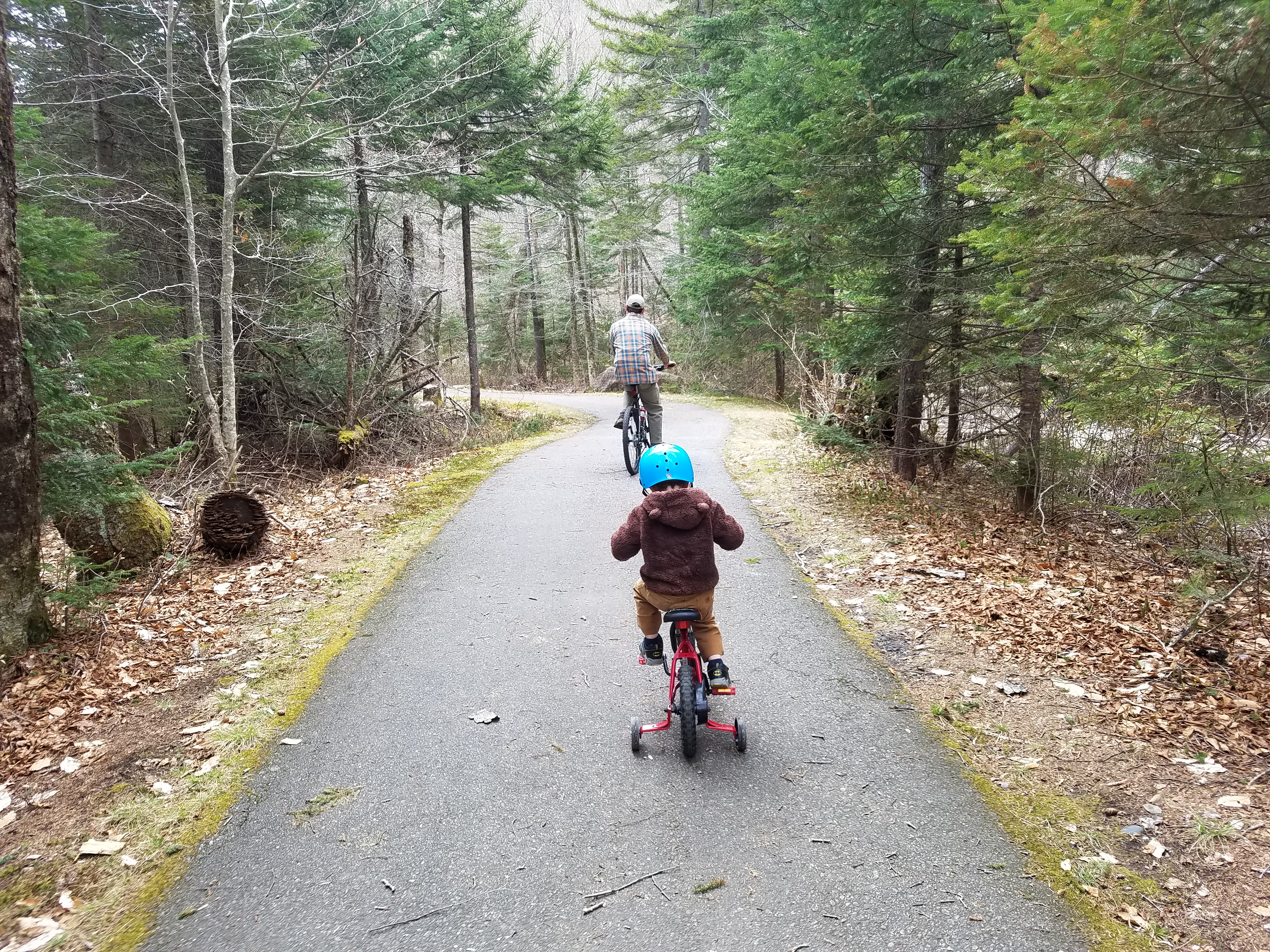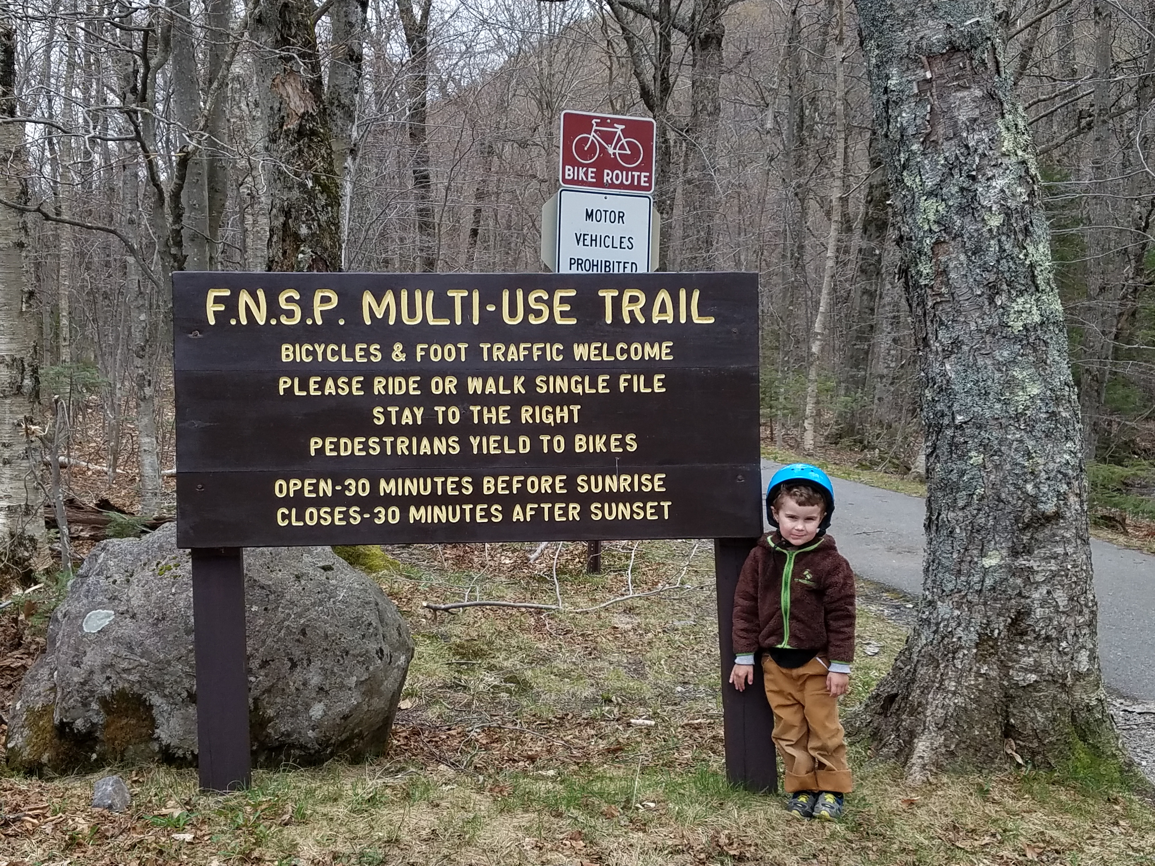 Last weekend we wanted to go for a bike ride. Alden has, just this spring, figured out how much fun bike riding is and we wanted to give him the experience of riding a long distance, instead of just circling around in our dirt driveway. He hasn’t quite mastered going down hills and using his brakes, so we picked a mostly flat section of the paved bike path in Franconia Notch State Park in Franconia, NH.