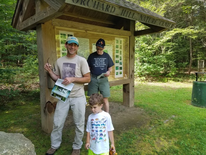 Last weekend while visiting family in Connecticut, we ventured out to one of Andrew’s childhood hiking spots. This little gem of conservation land is nestled among the busy streets and neighborhoods in Newtown, Connecticut. First we drove along the northern edge of the property on Orchard Hill Road as Andrew tried to remember where to park, but then he remembered that there was a new small parking lot off Huntington Road. And he was correct, a huge parking lot, kiosk and trails welcomed us to the “The Orchard Hill Nature Center“.