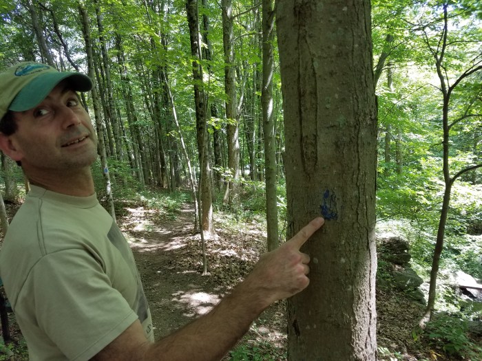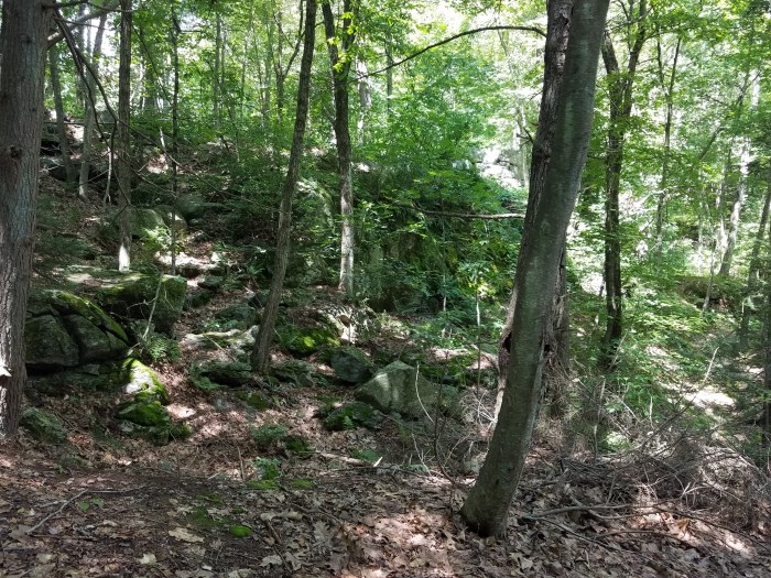 Even before Andrew started tromping around on this property, there is an interesting history. It was a farm settled in the 1700’s and you can still see the stonewalls criss-crossing through the woods, indicating that this was once open pasture. At the North Branch of Pootatuck River crossing you will see remnants of a stone dam. This was once a sawmill, site of a grist mill, cider mill, and a wool-carding mill. It’s amazing that today nature has taken back this once vibrant area. In 1976, Newtown purchased the property, but it sat without organized use for several decades. Andrew and his friends made trails and explored throughout the property in the 1980’s, when they built crude log bridges and blue-blazed a few trails that became part of today’s network. Recently the Newtown Lions adopted the area, McCord Engineering revised the map, and the Town & Country Garden Club identified plants for an interpretive trail. It’s now a full-fledged hiking area, with plenty of parking and easy access.